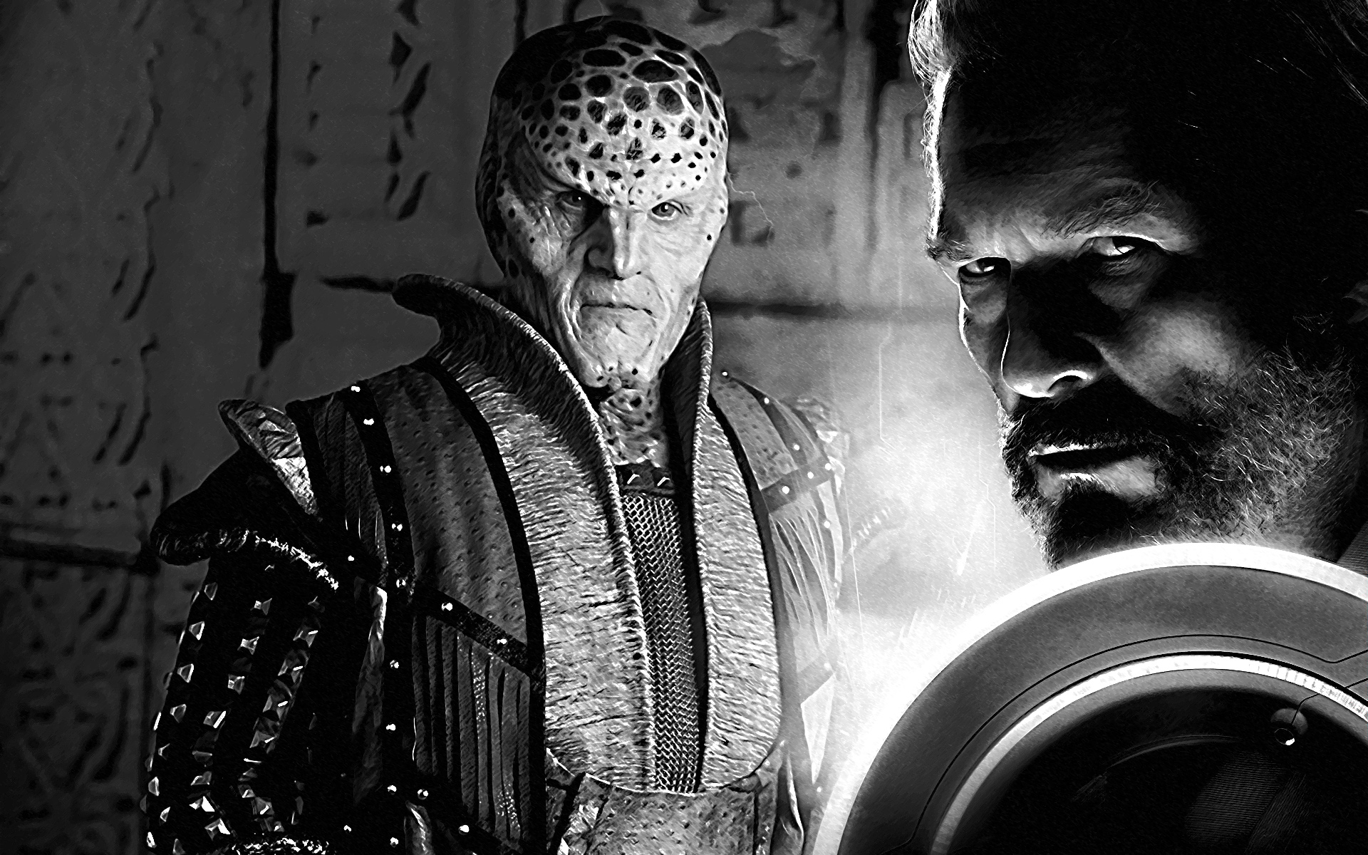 Description: A man with a mask on and a man with a beard stand next to each other in a dark room.