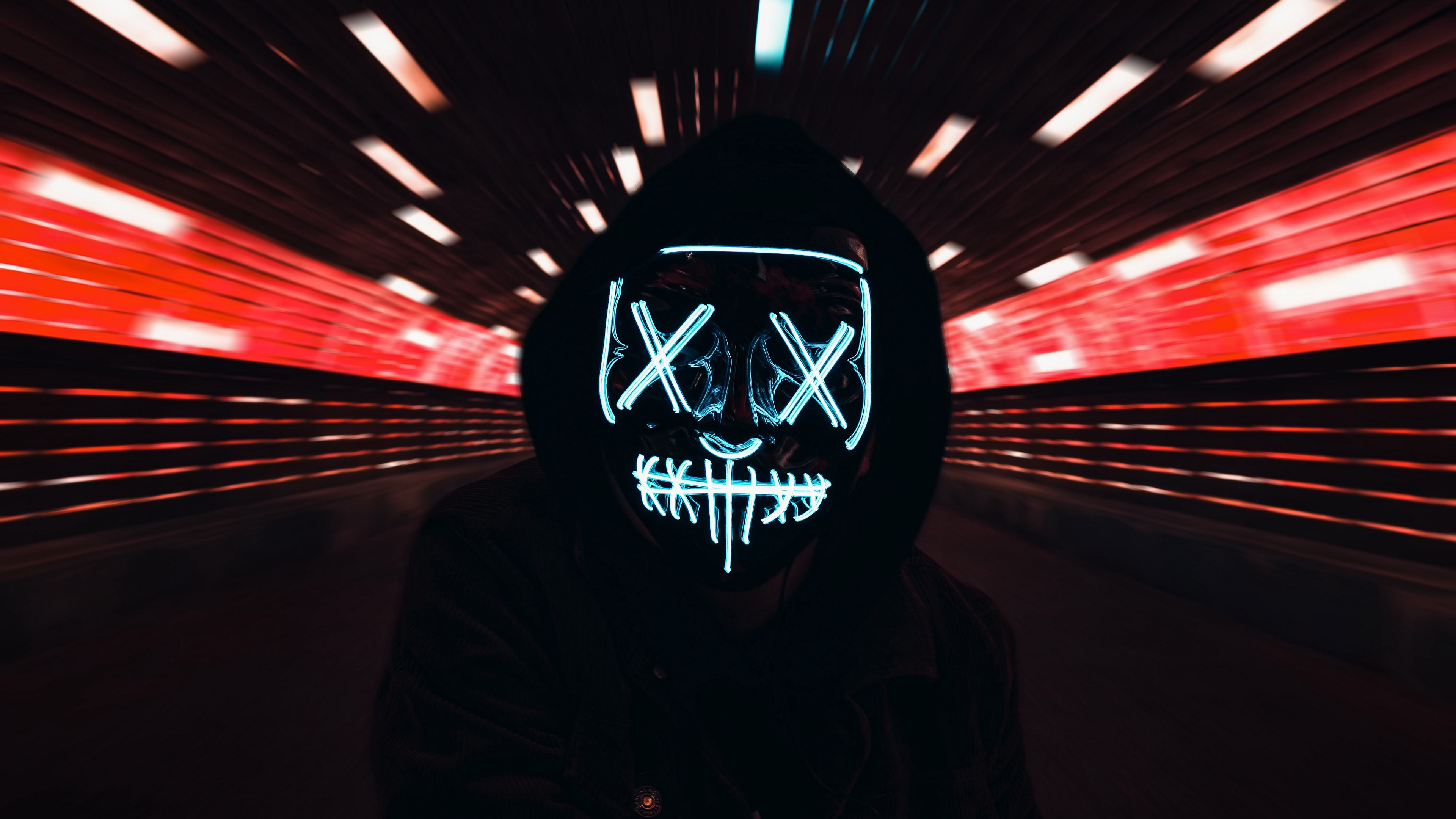 Description: A man wearing a mask in a dark tunnel with red lights behind him and a black jacket with a hood on.
