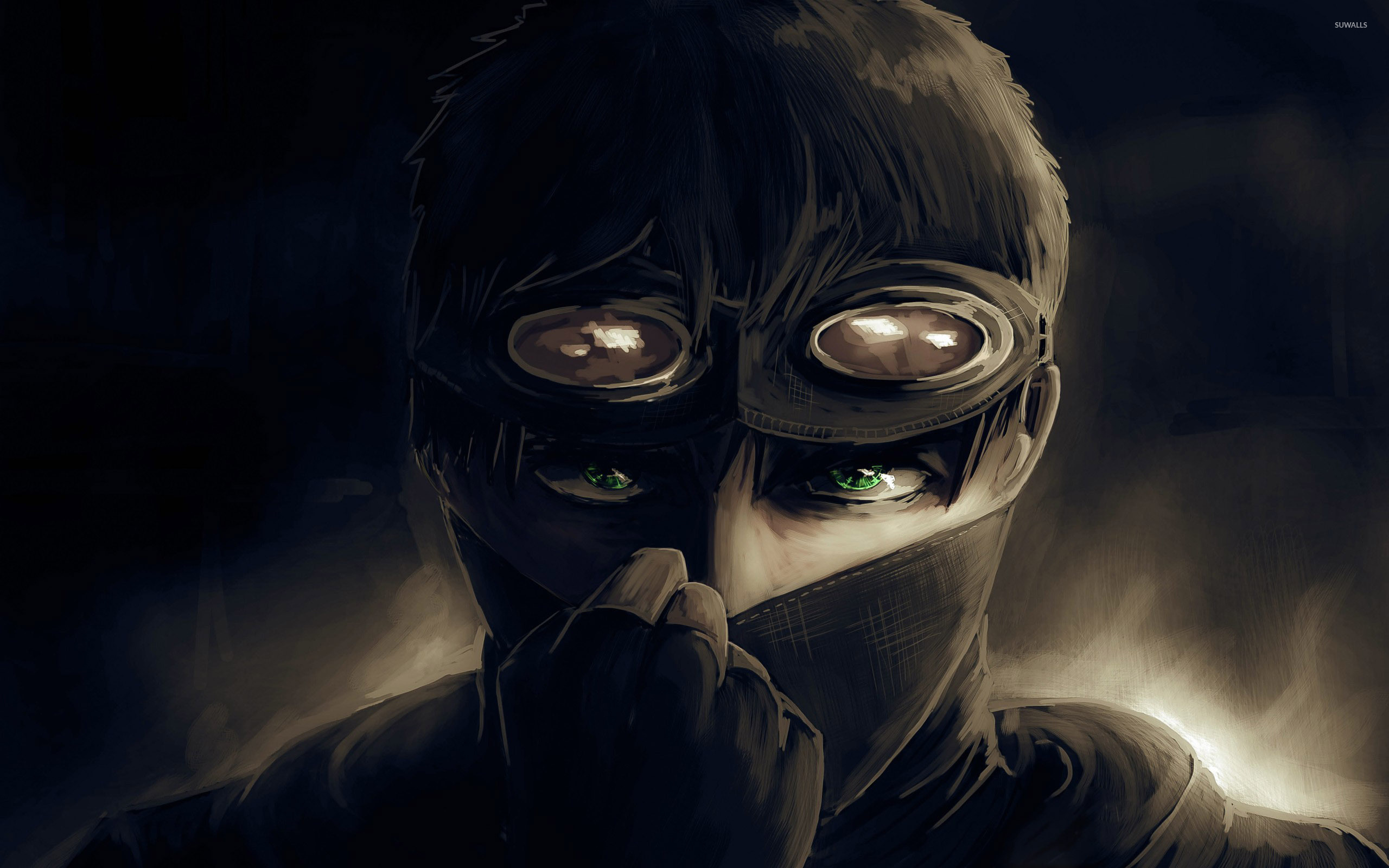 Description: A man with a mask on and green eyes is covering his mouth with his hand and looking at the camera.