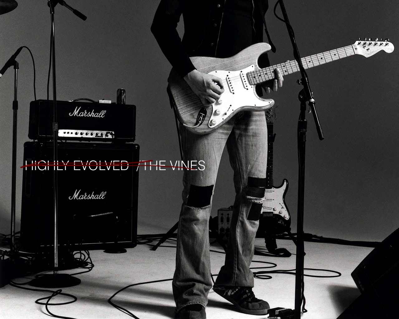 Description: A man standing in front of a microphone and guitar in front of a microphone and amps on a stage.