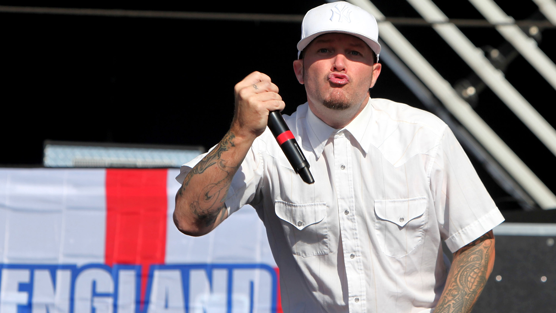 Description: A man with a microphone in his hand and a sign in the background behind him that says england on it.