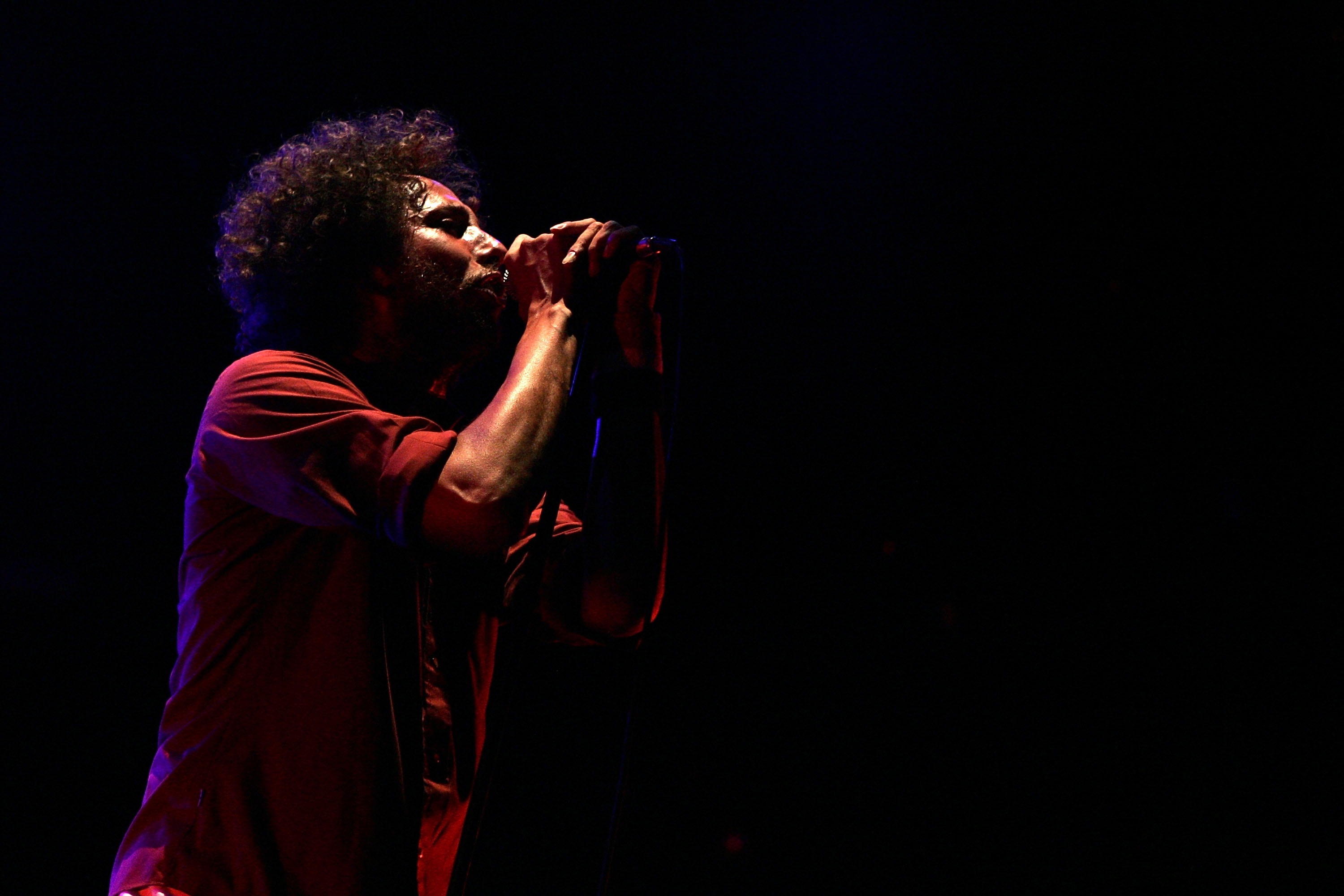 Description: A man with a microphone in his hand on stage at a concert or concert.