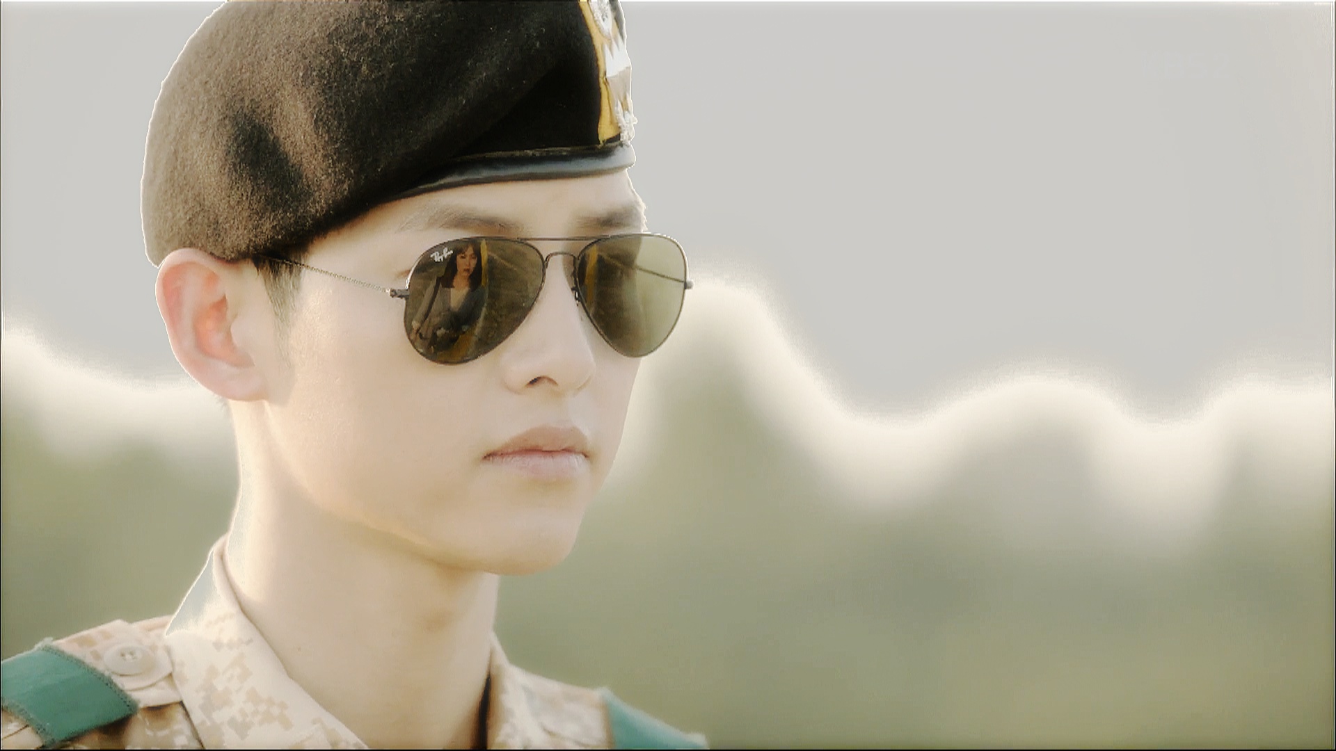 Description: A man in a military uniform wearing sunglasses and a hat with a green tie and a green jacket and a white background.