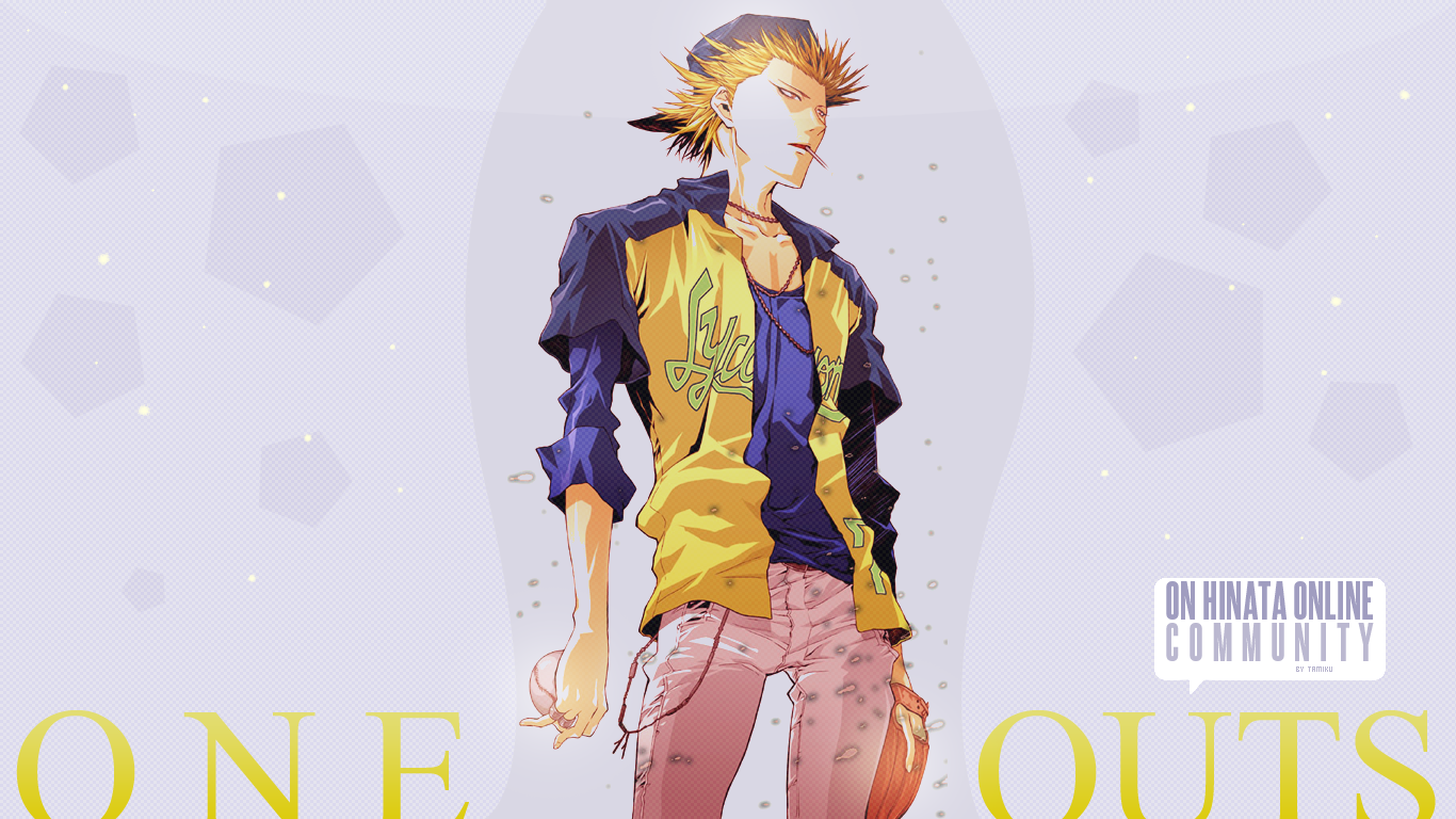 Description: A man with a mohawk standing in front of a poster with words on it that say one outs.