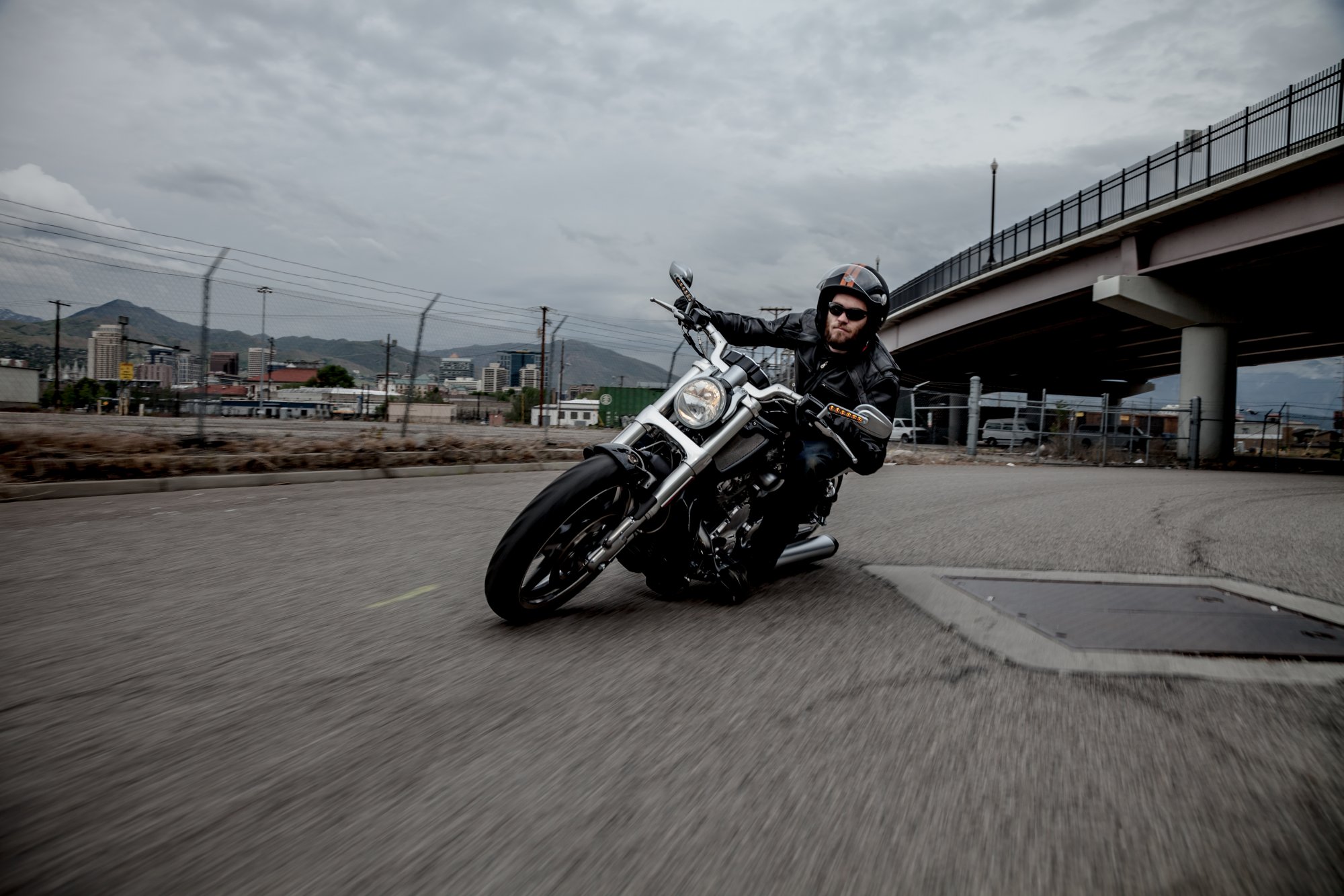 Description: A man riding a motorcycle down a street next to a bridge and a bridge overpass in the background.