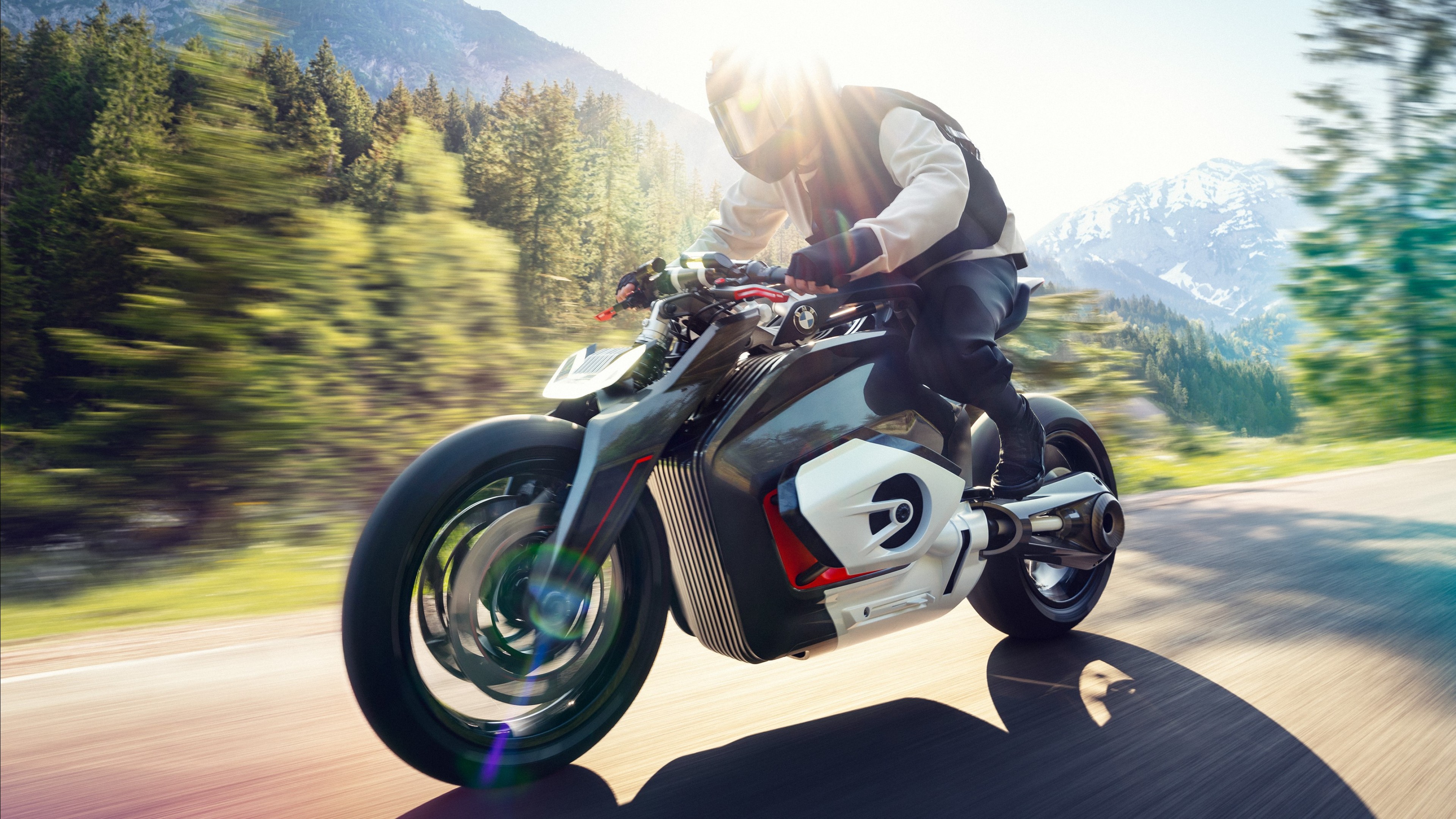 Description: A man riding a motorcycle down a road next to a forest filled with trees and mountains in the background.