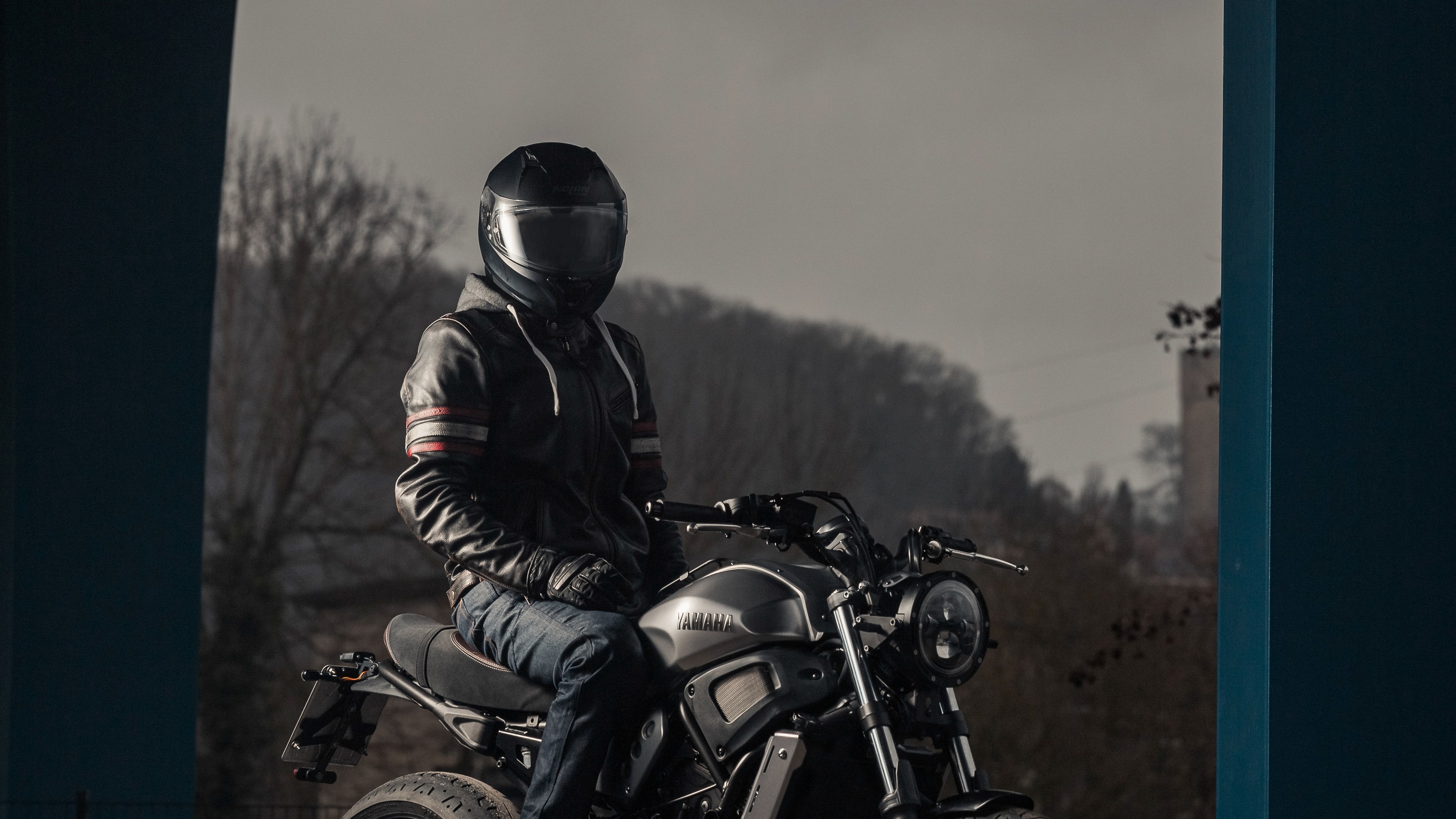Description: A man sitting on a motorcycle in the dark with a helmet on and a black jacket on and a black jacket on.