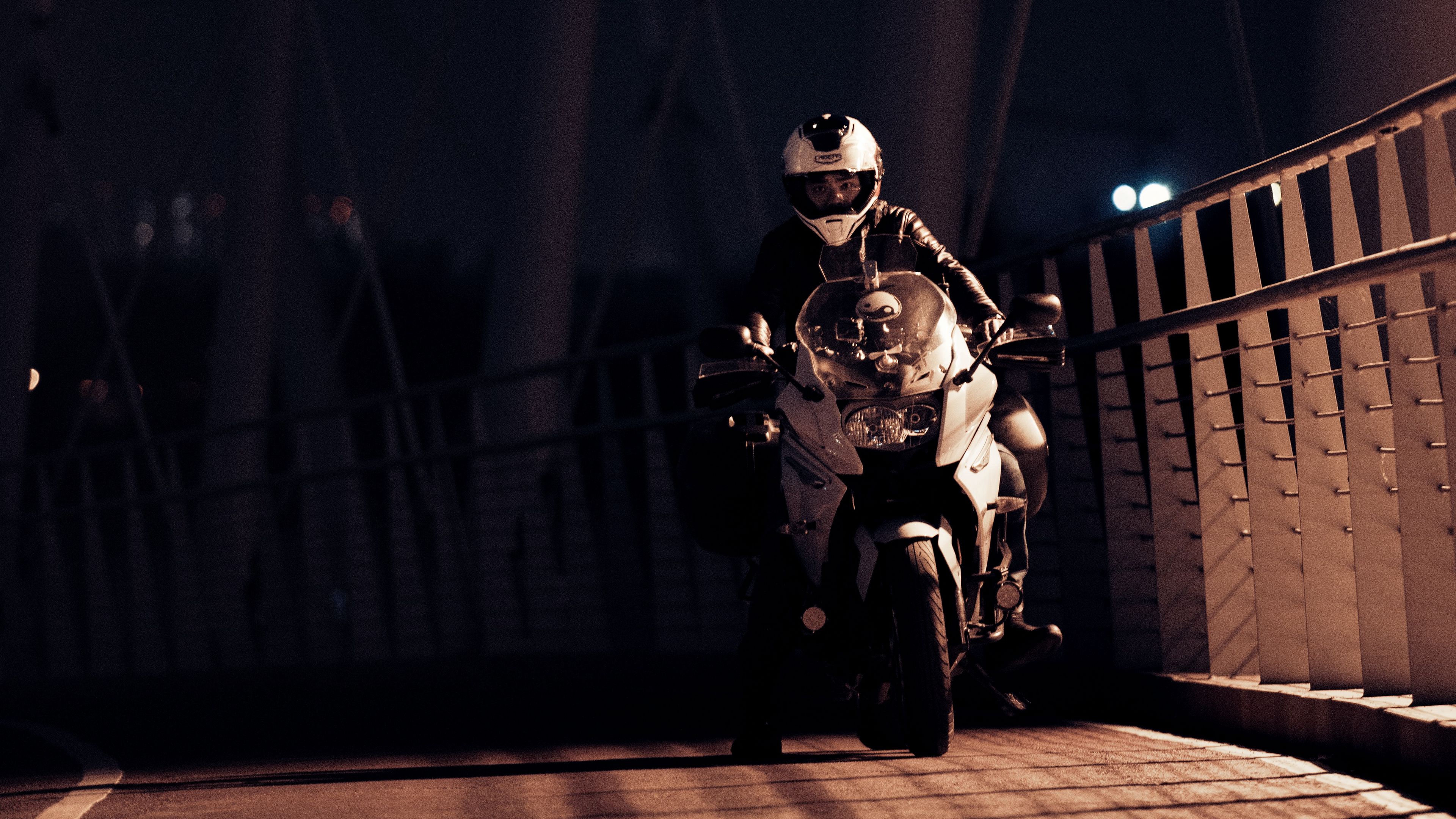 Description: A man riding a motorcycle down a street at night time with a helmet on and a helmet on his head.