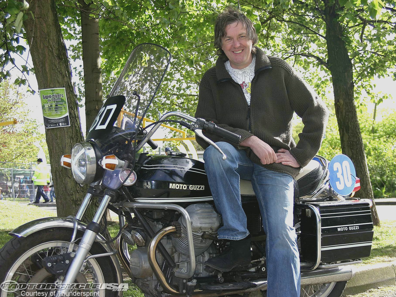 Description: A man sitting on a motorcycle in a park with trees in the background and a sign in the foreground.