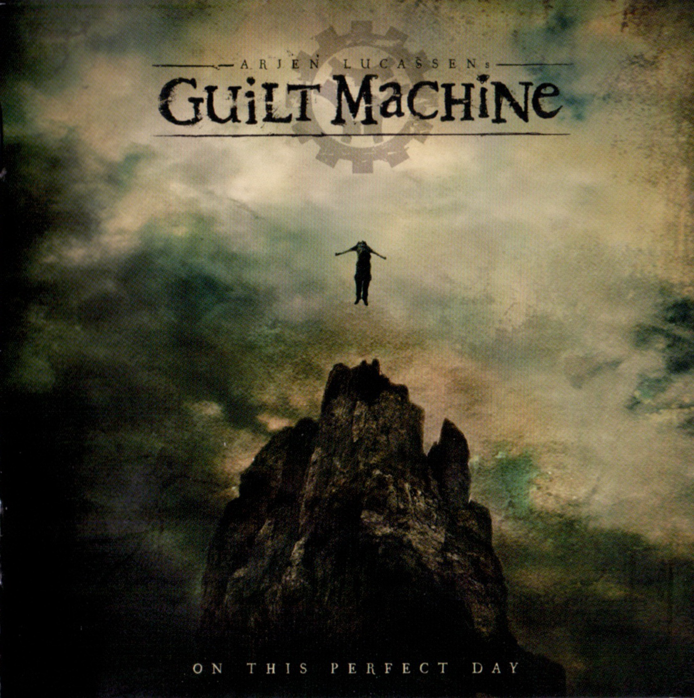 Description: A man standing on top of a mountain with a gear wheel on it's back and the words guilt machine on the front.