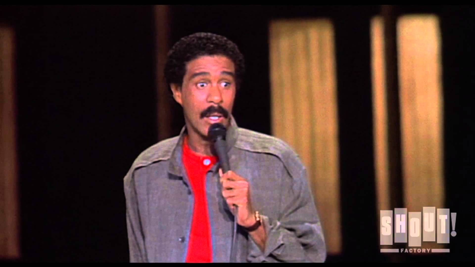 Description: A man with a mustache and a red shirt on holding a microphone in his hand and looking up at the camera.