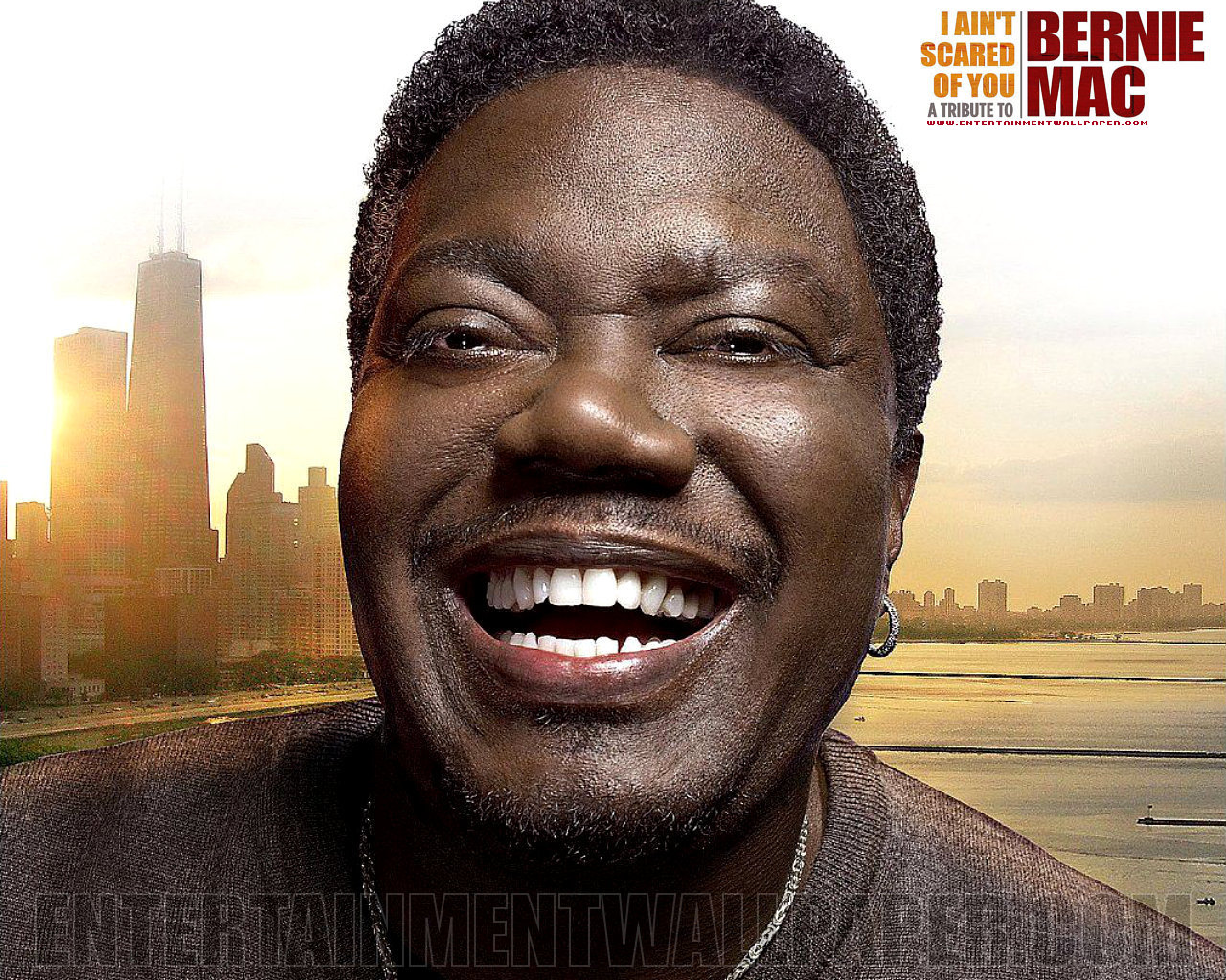Description: A man with a necklace on his neck and a city in the background with a sunset in the sky.