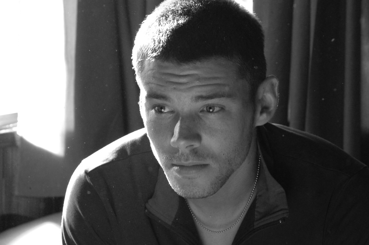 Description: A man with a necklace on his neck looking at the camera with a serious look on his face and a window behind him.