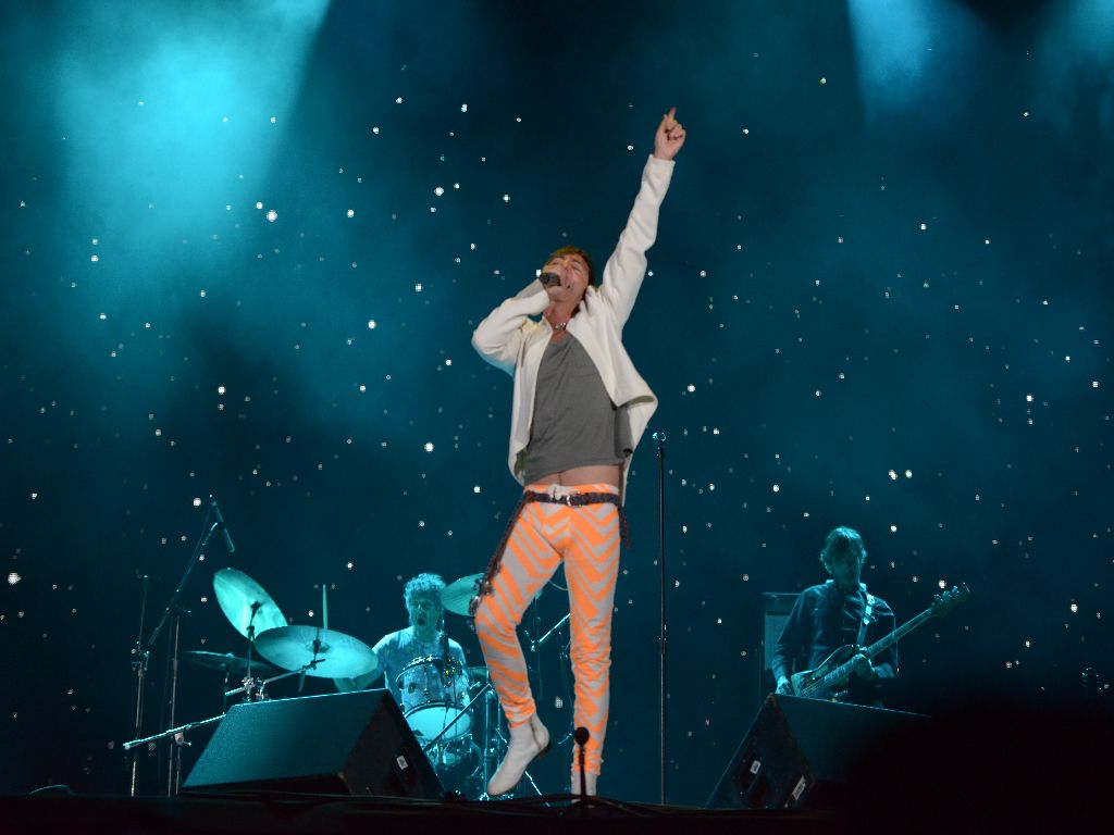 Description: A man in an orange pants and a white jacket on stage with his arms up in the air and his hands in the air.