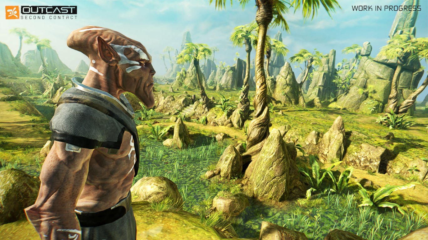 Description: A man standing in a lush green field next to a palm tree and rocks in a jungle setting with a sky background.