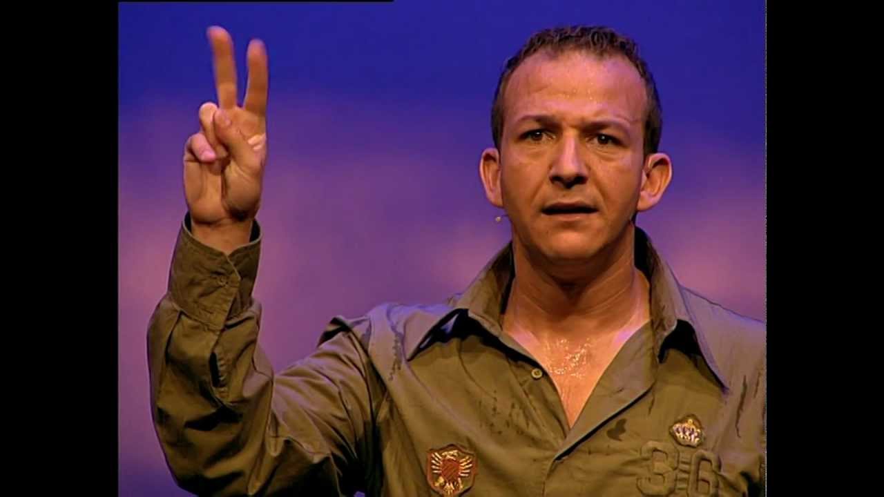 Description: A man in a green shirt is making a peace sign with his hands and a purple background with a blue sky.