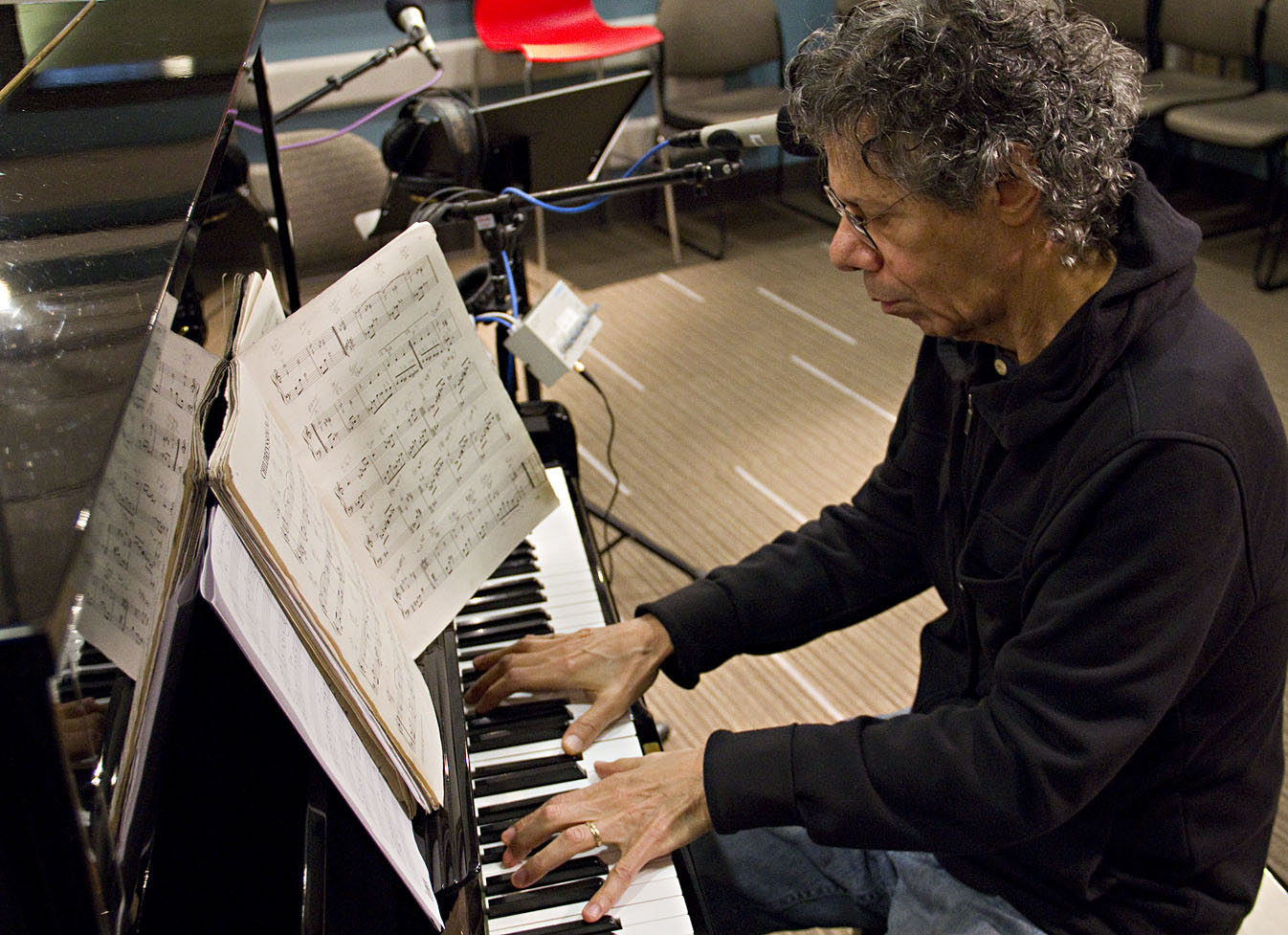 Description: A man sitting at a piano with sheet music on it's keyboard and a microphone behind him and a microphone behind him.