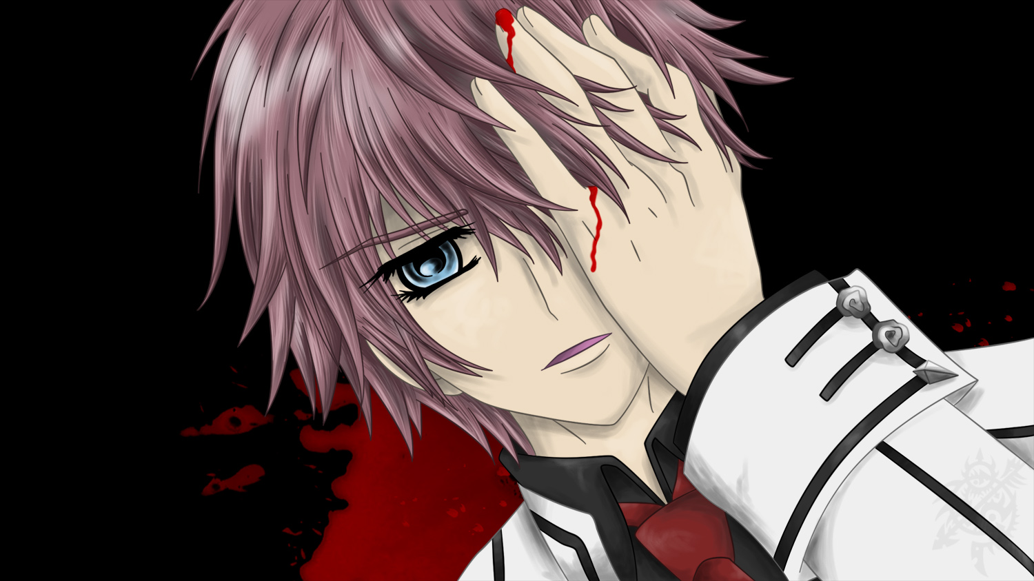 Description: A man with pink hair and a tie covering his face with his hands and a blood stain on the wall.