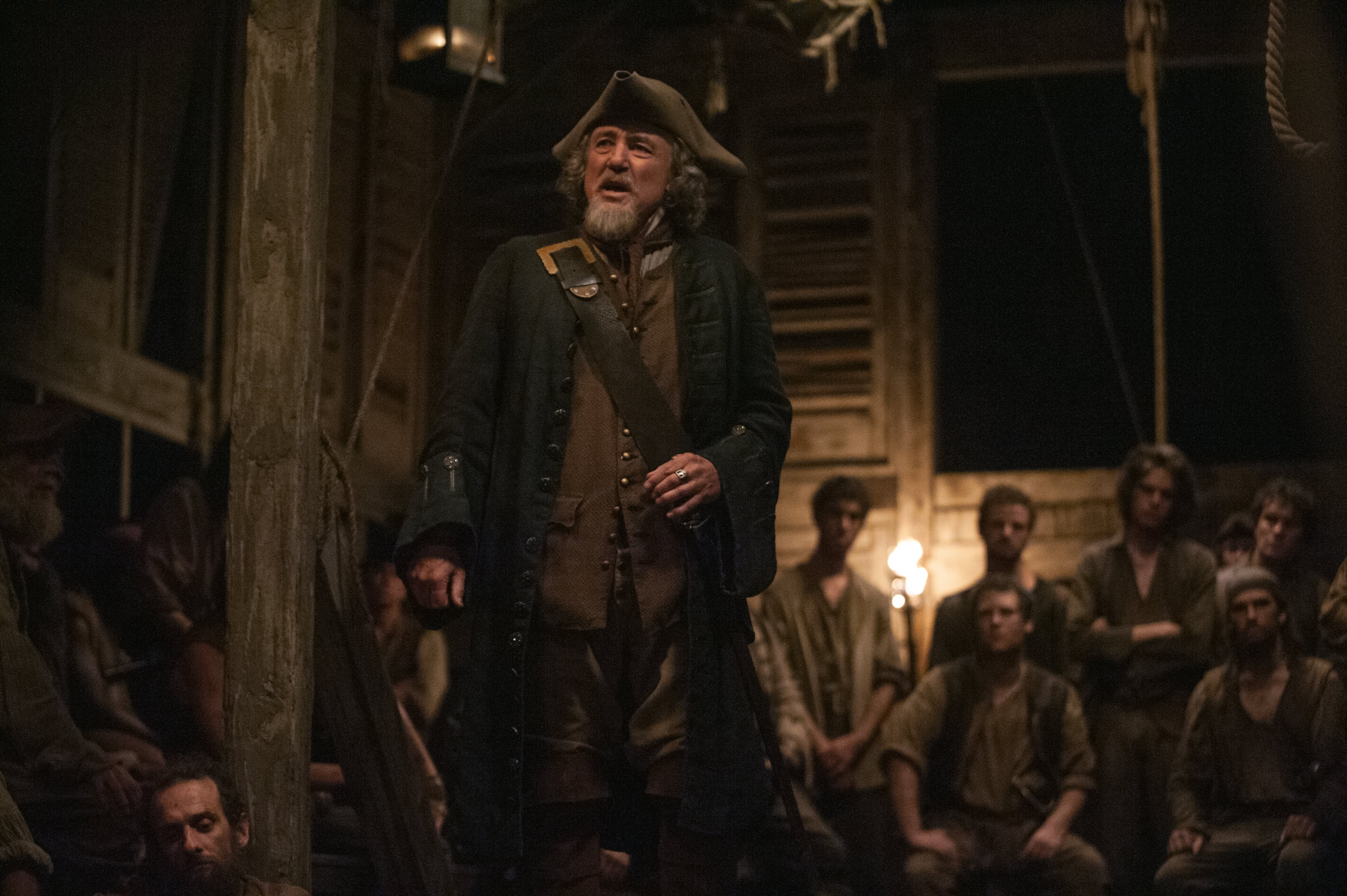 Description: A man in a pirate costume standing in front of a crowd of people in a room with a light on.