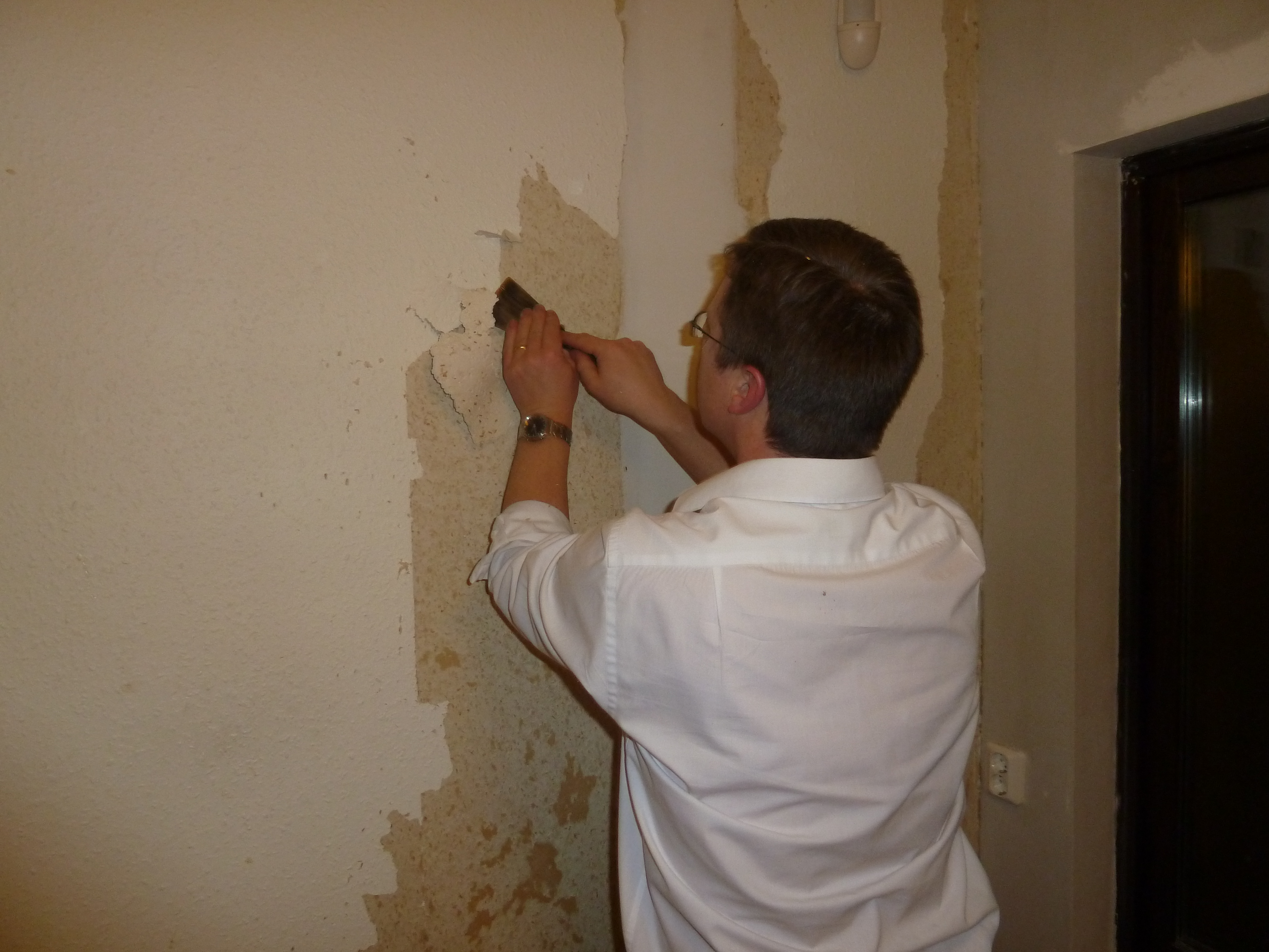 Description: A man is plastering a wall with a paint roller and a paint roller in his hand and a paint roller in his other hand.