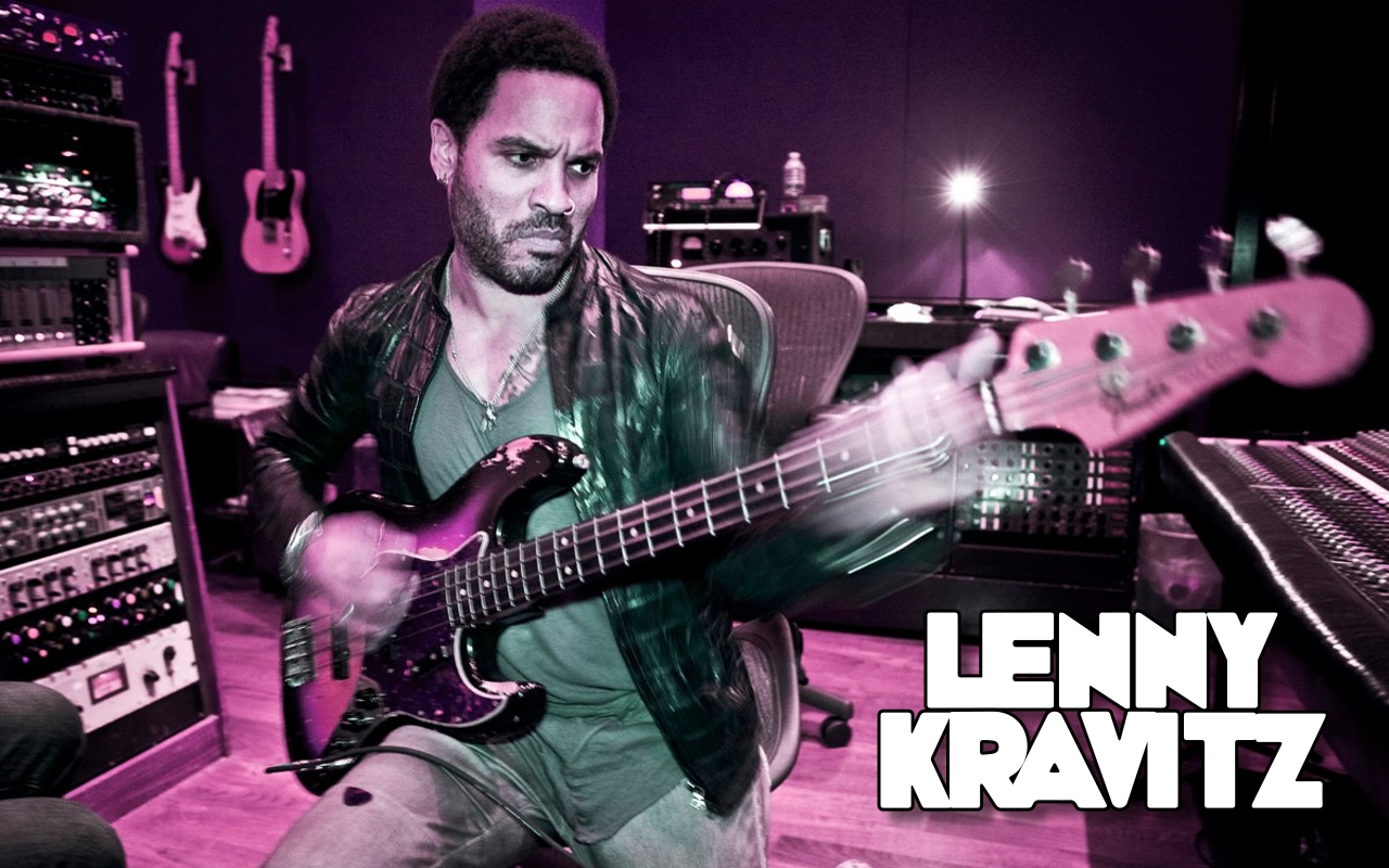 Description: A man playing a guitar in a recording studio with sound equipment behind him and a purple background with the words.