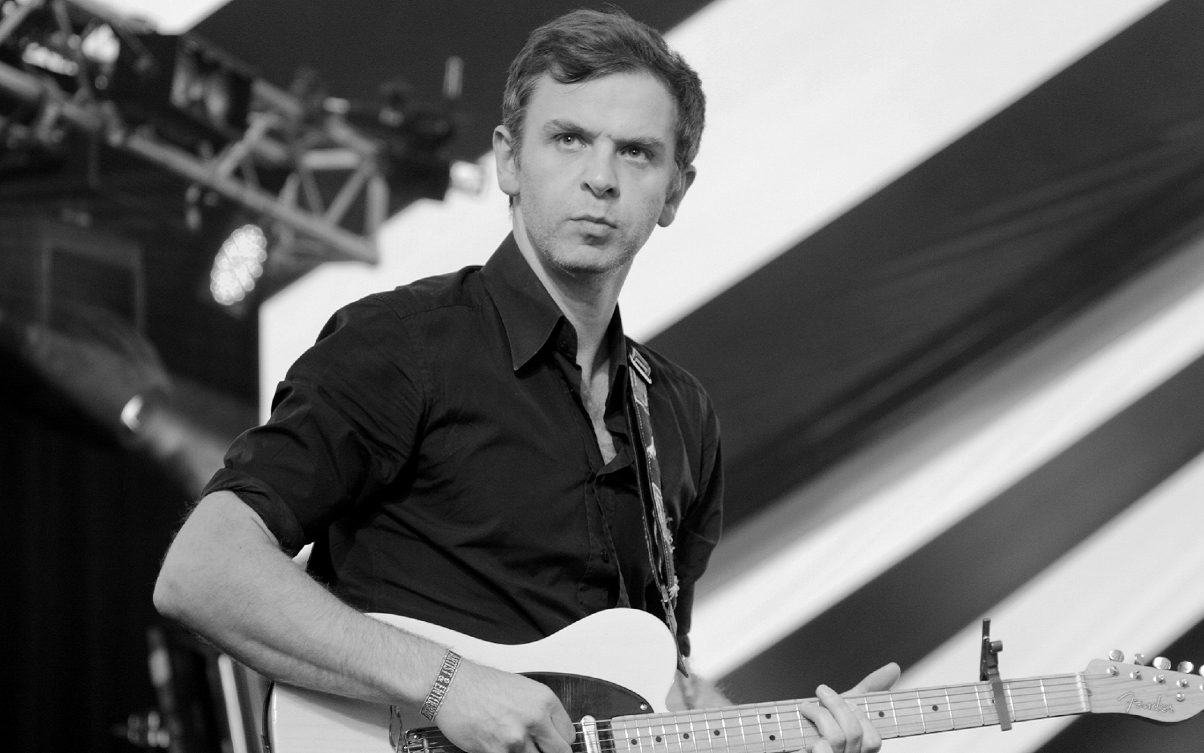 Description: A man playing a guitar on stage with a microphone and a flag in the background with a spotlight on the wall.
