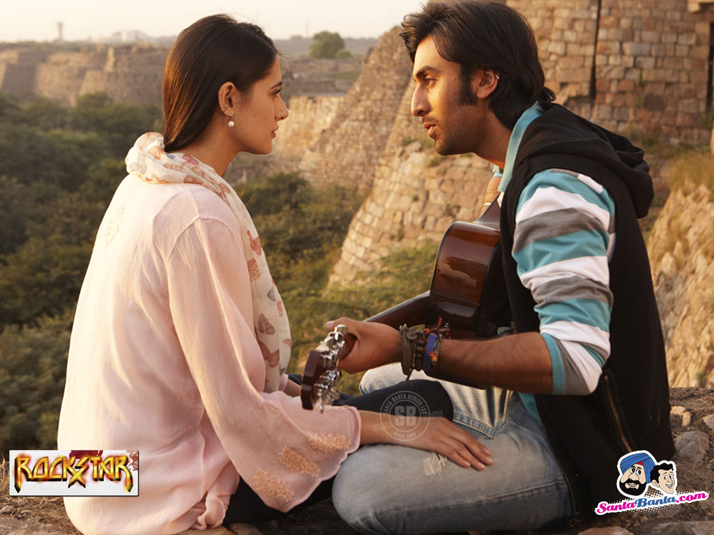 Description: A man playing a guitar next to a woman on a rock wall with a view of a city below.