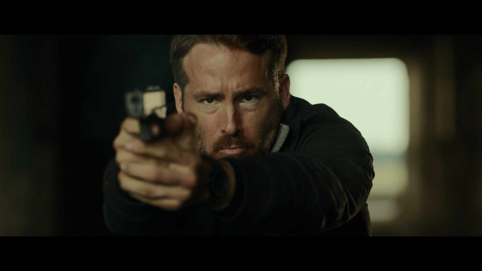Description: A man pointing a gun at the camera with a serious look on his face and face.
