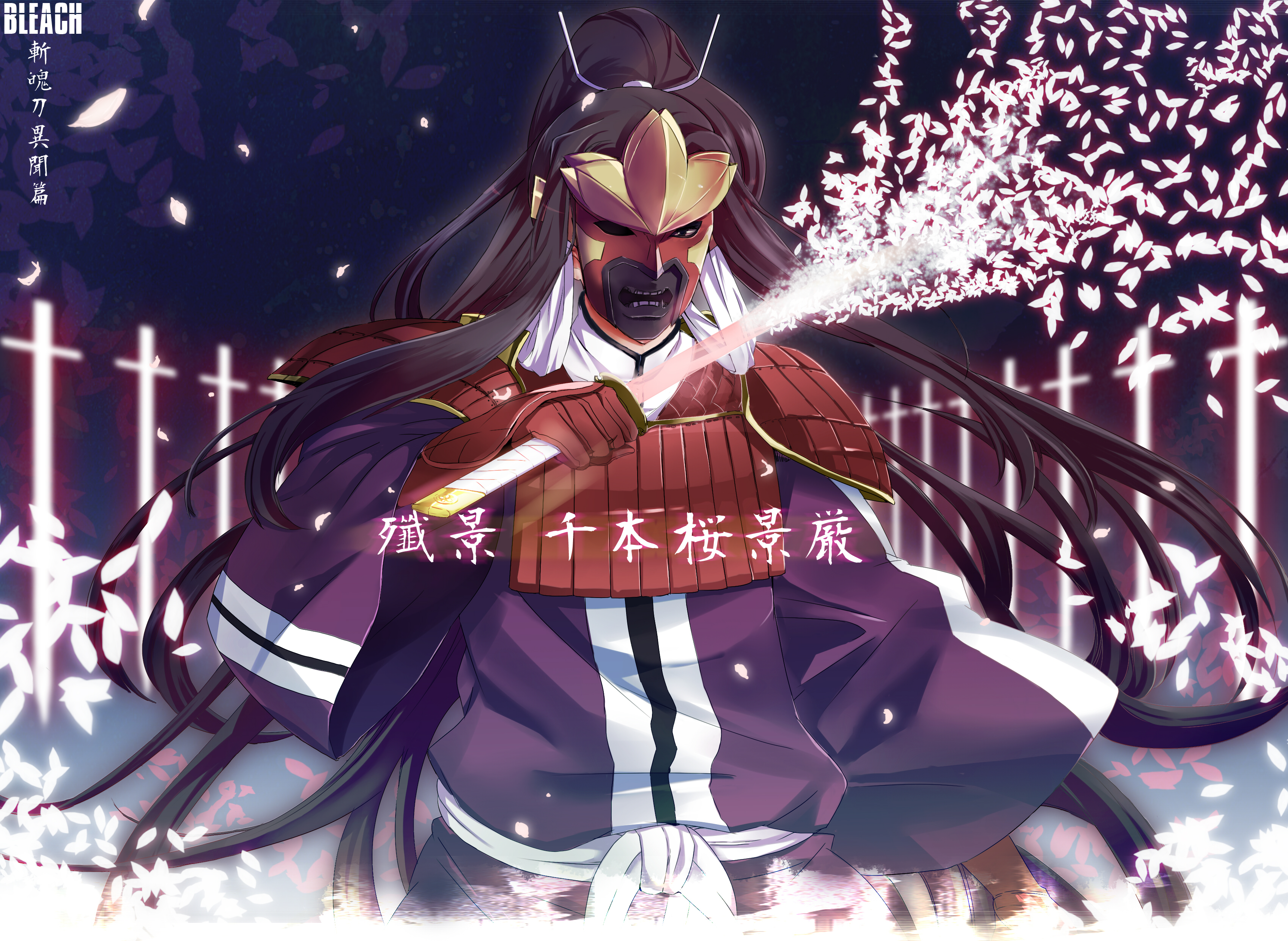 Description: A man in a purple outfit holding a sword and fireworks in his hand with a purple background and white writing.