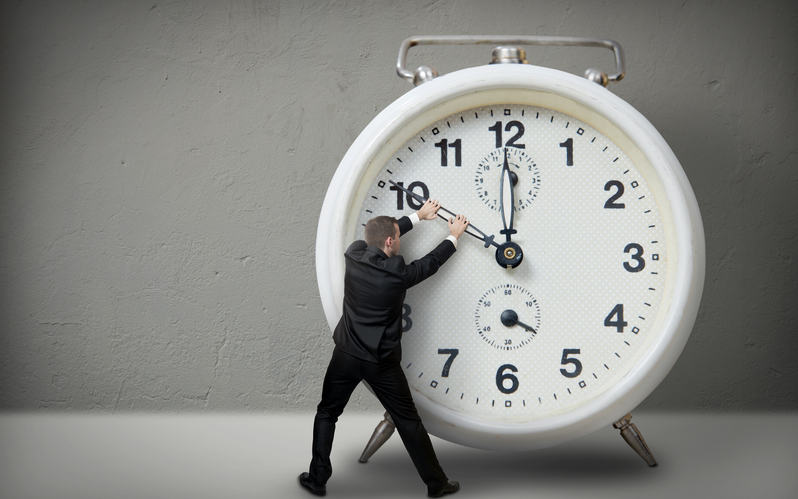 Description: A man in a suit is pushing a clock on a stand with his hands on the clock face and the time is 11 20.