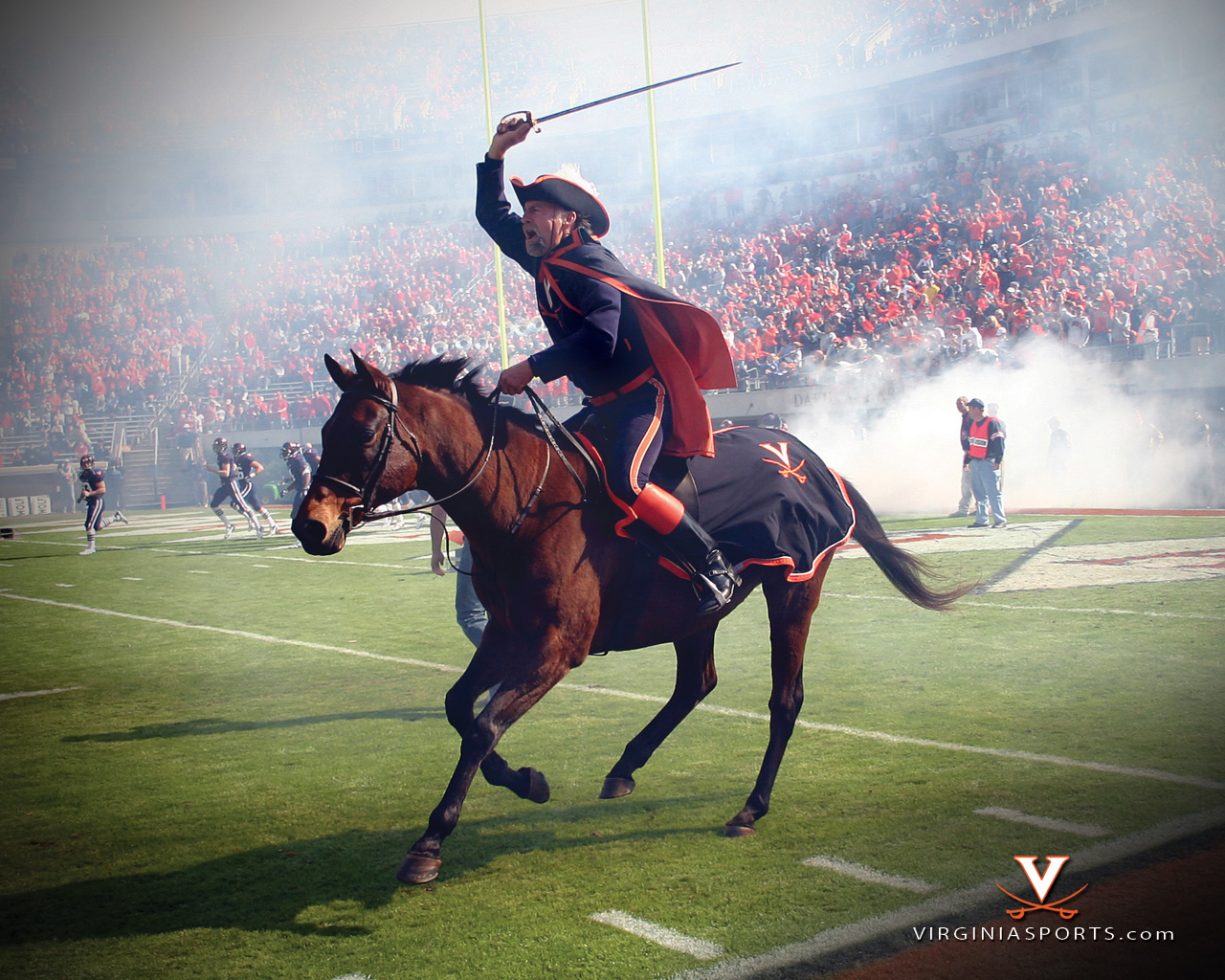 Description: A man in a red and black uniform riding a horse on a field with a sword in his hand.