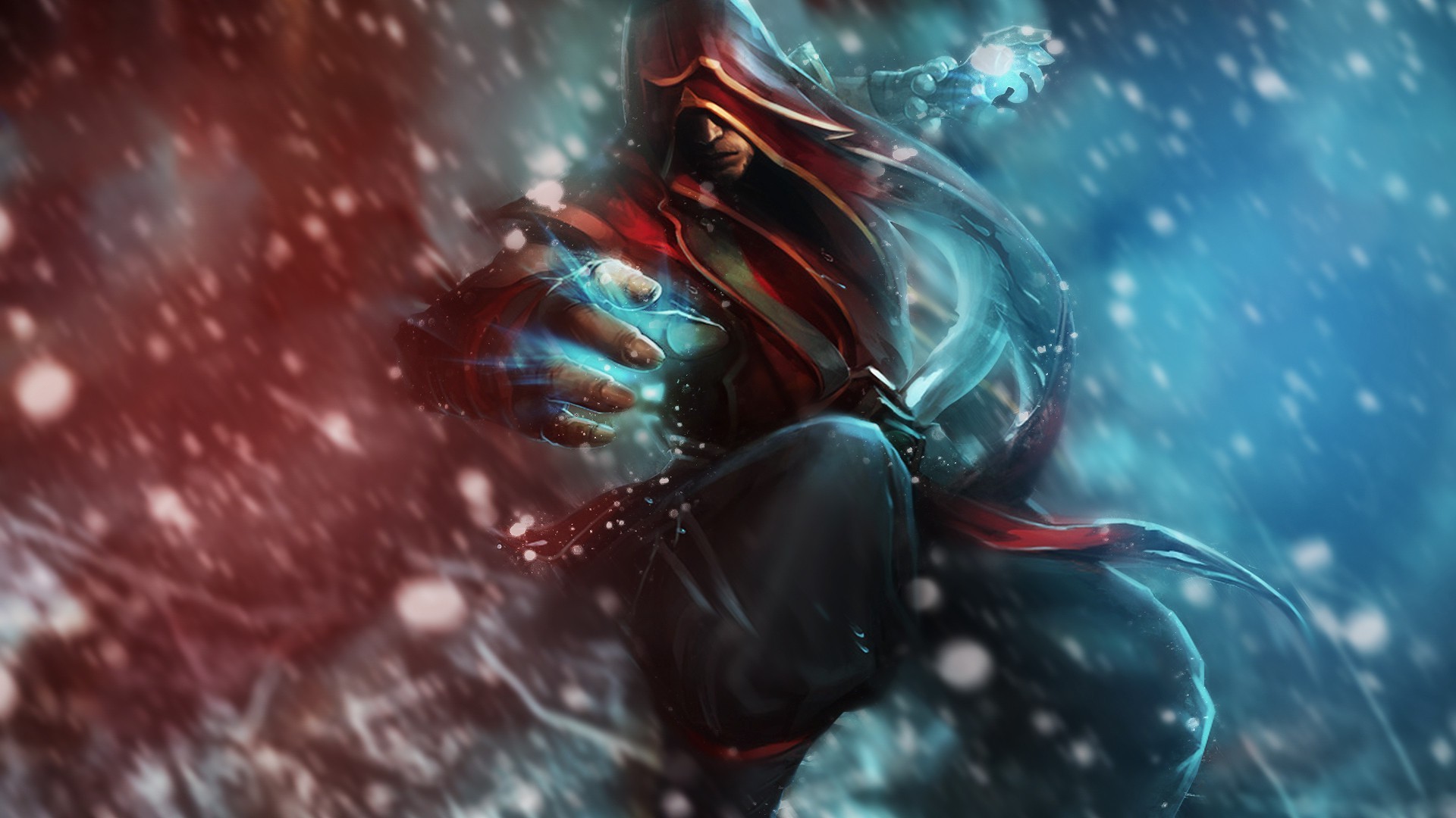 Description: A man in a red and blue outfit holding a red object in his hands in the snow with snow falling all around him.