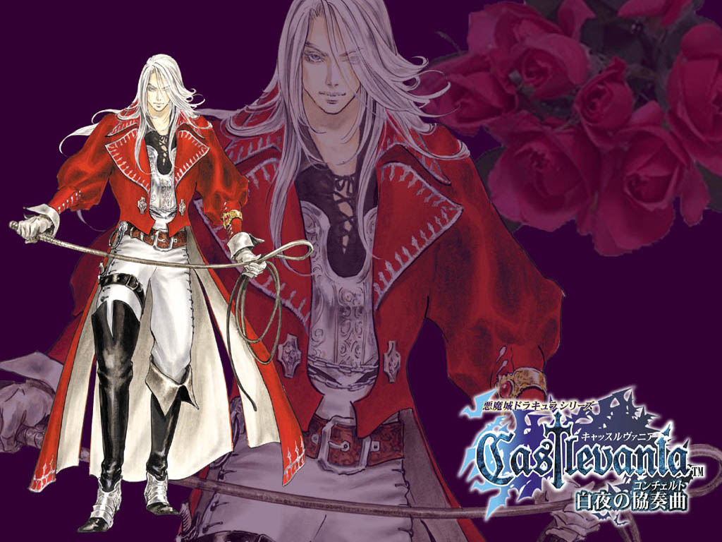 Description: A man in a red coat and white pants holding a sword and a rose in his hand.