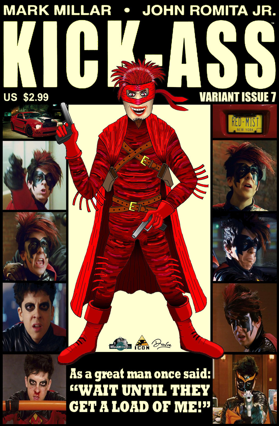 Description: A poster of a man in a red costume with a knife in his hand and a caption that reads.