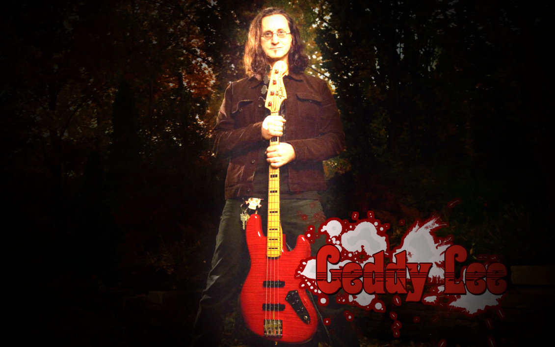 Description: A man holding a red guitar in a dark forest with a grungy background and a grungy logo.