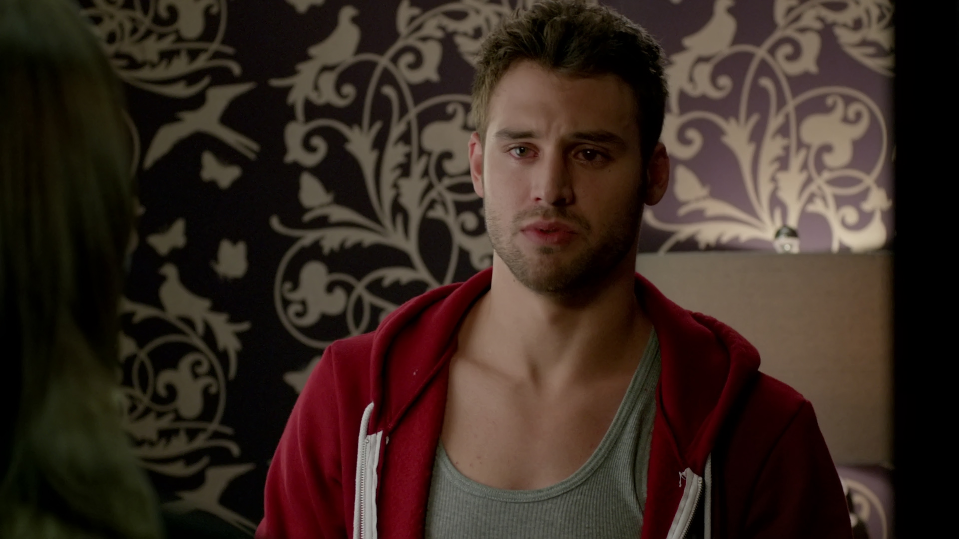 Description: A man in a red jacket is talking to a woman in a green dress and a wallpapered wall.