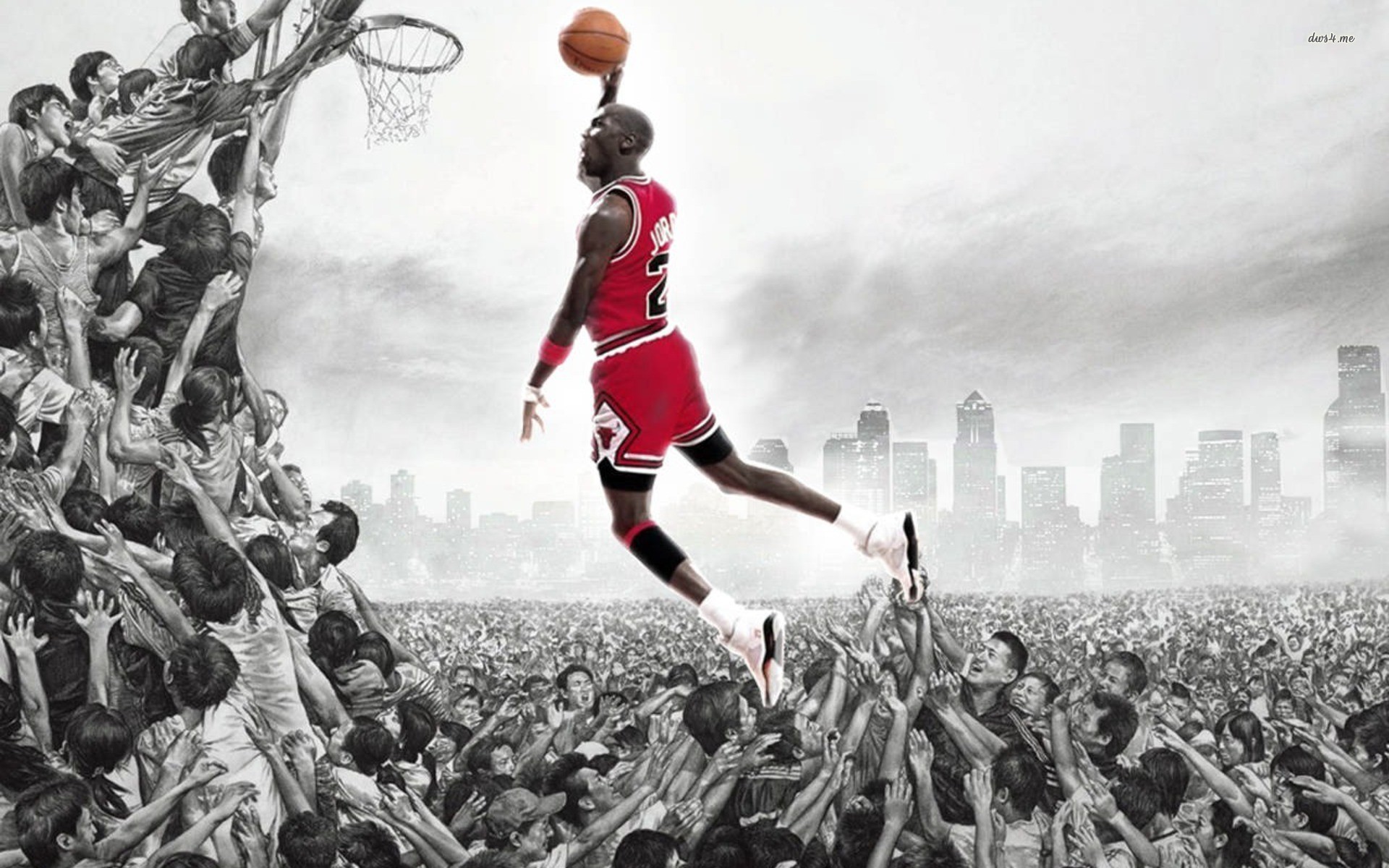 Description: A man in a red jersey is playing basketball in a crowd of people with a basketball in his hand.