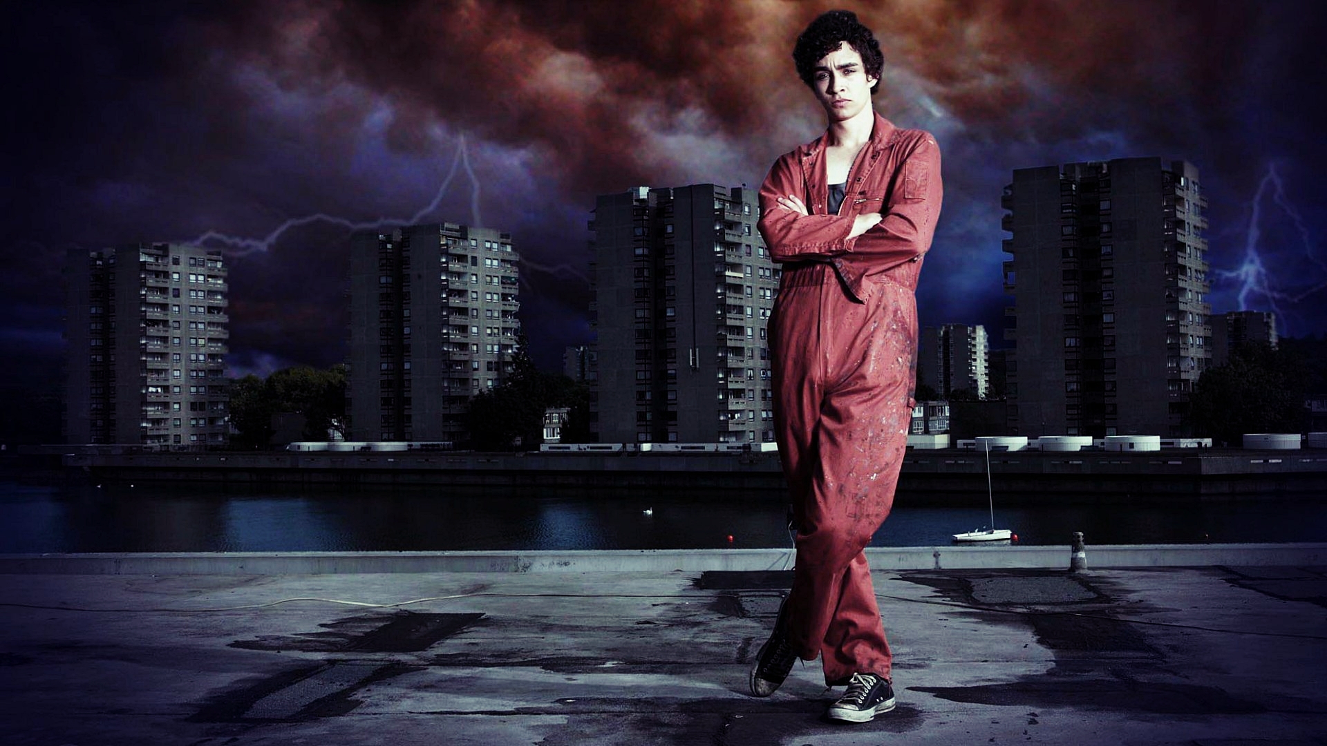 Description: A man in a red jumpsuit standing in front of a city skyline with lightning in the background and a lightning bolt in the sky.