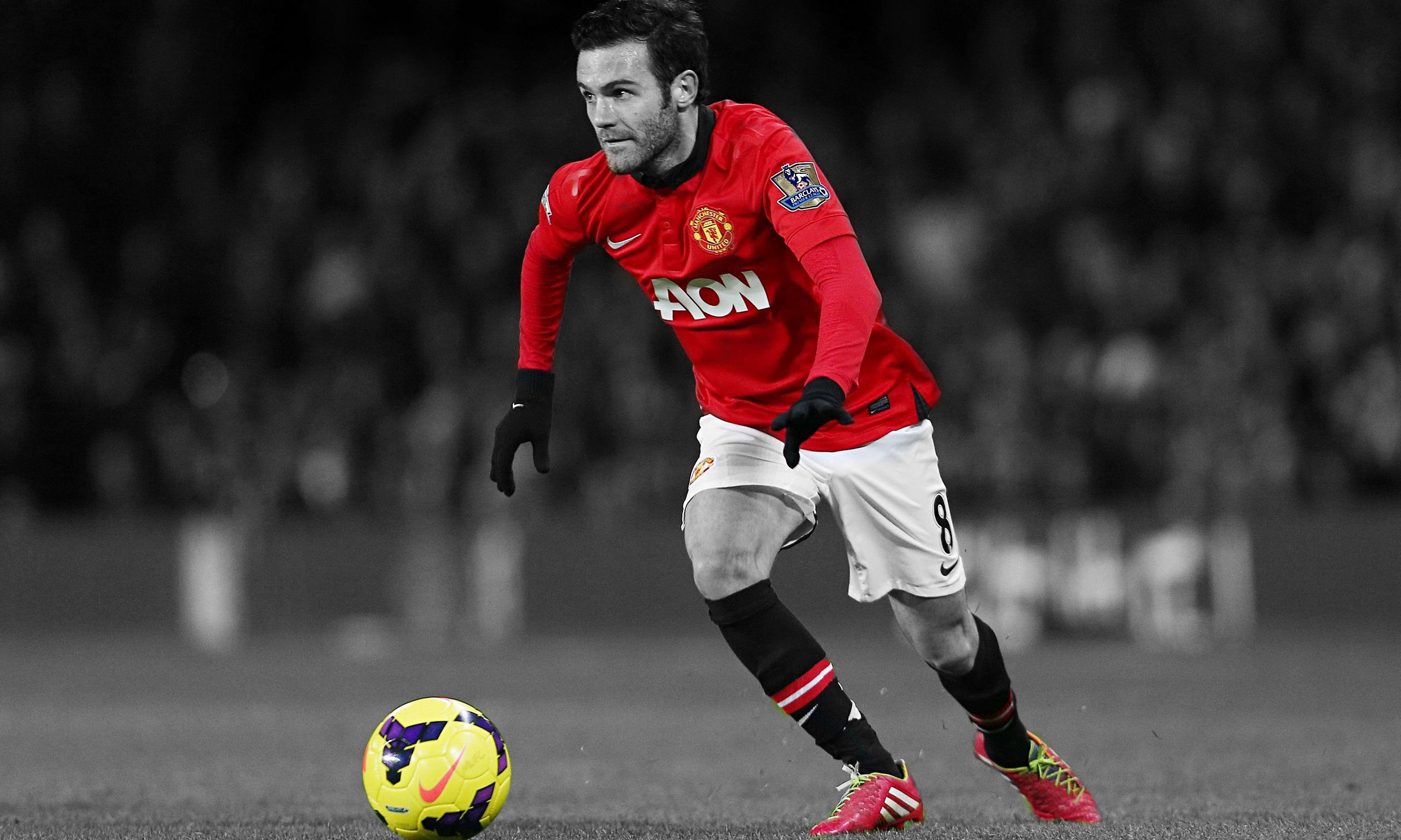 Description: A man in a red shirt is playing soccer on a field with a yellow ball in front of him.
