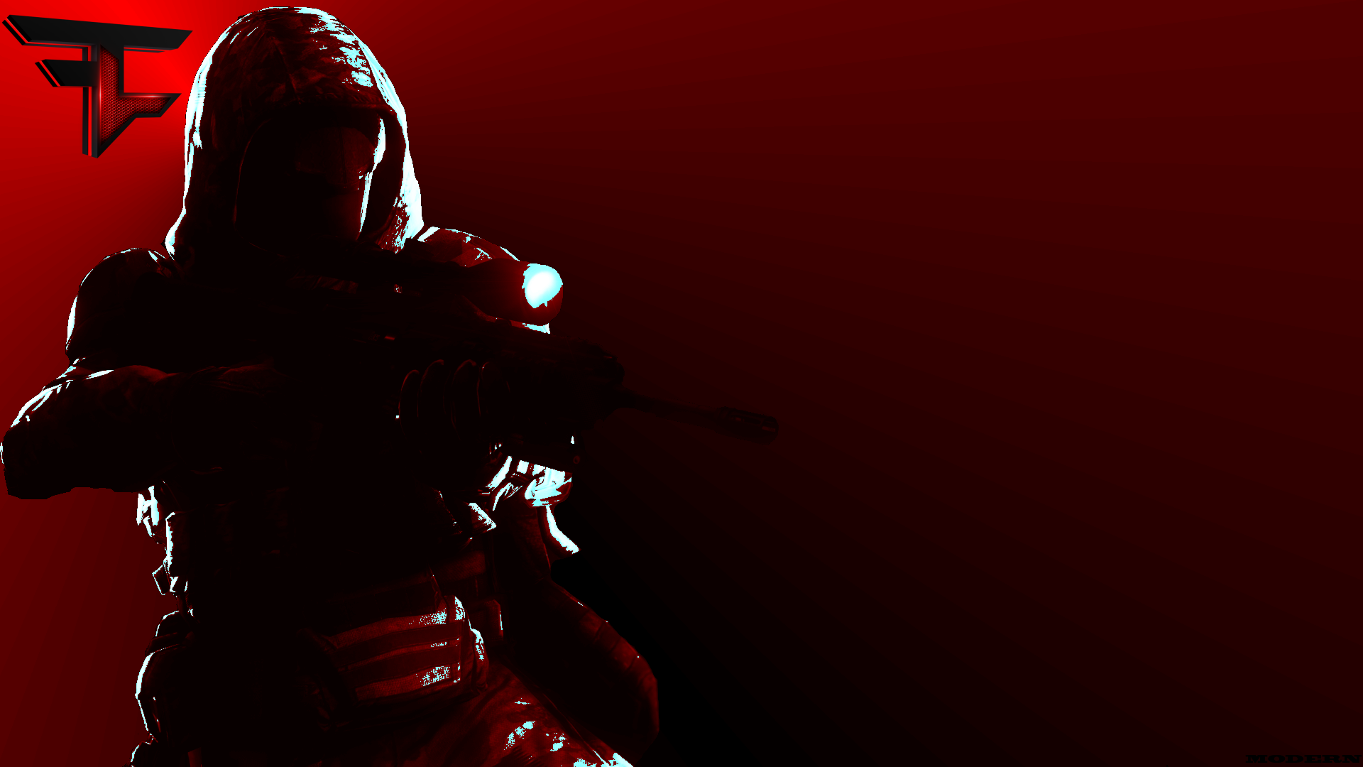 Description: A man in a red suit holding a gun in his hand and a red background behind him with a red triangle.