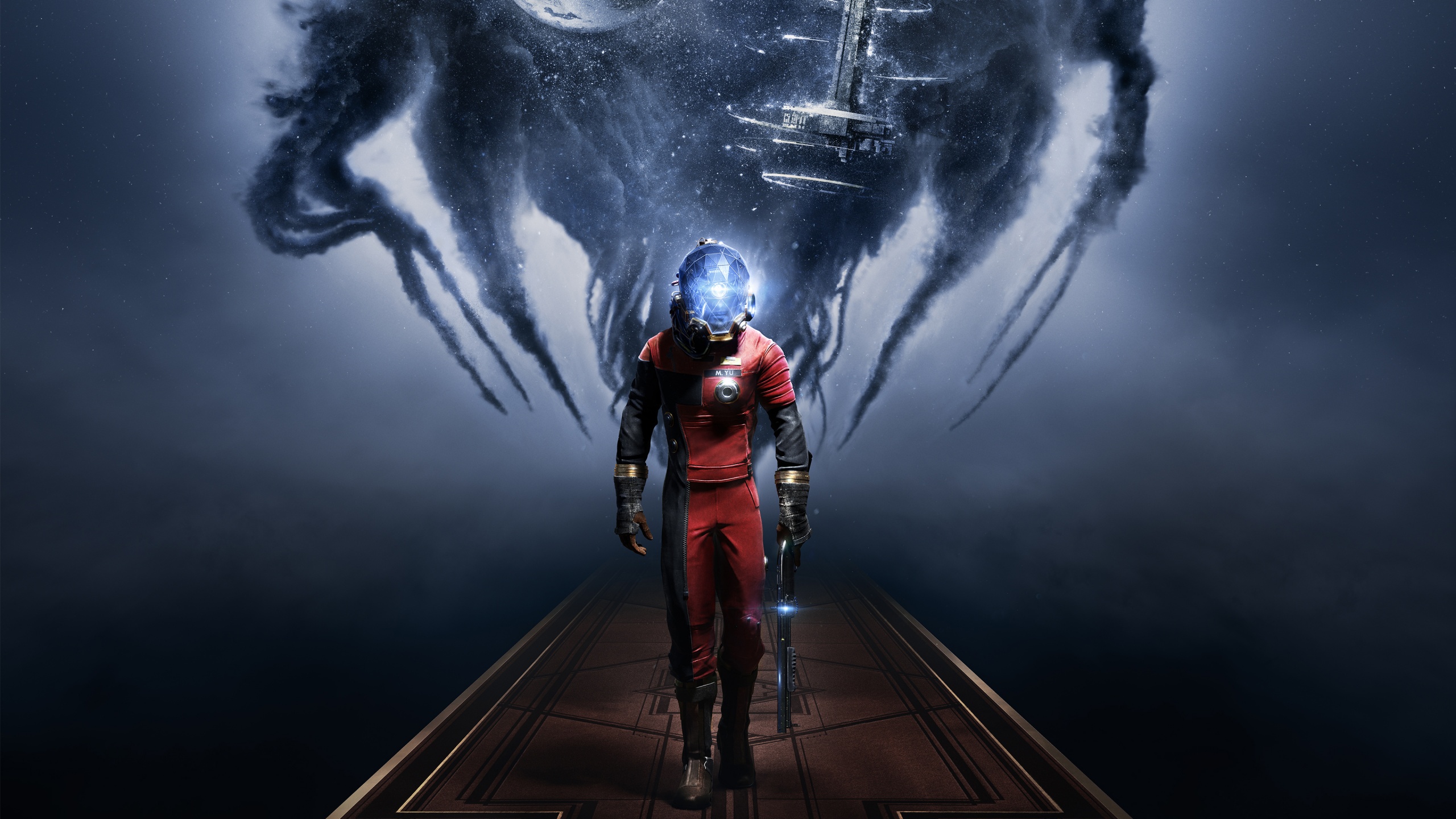 Description: A man in a red suit walking down a hallway with a giant creature in the background and a ship in the sky.
