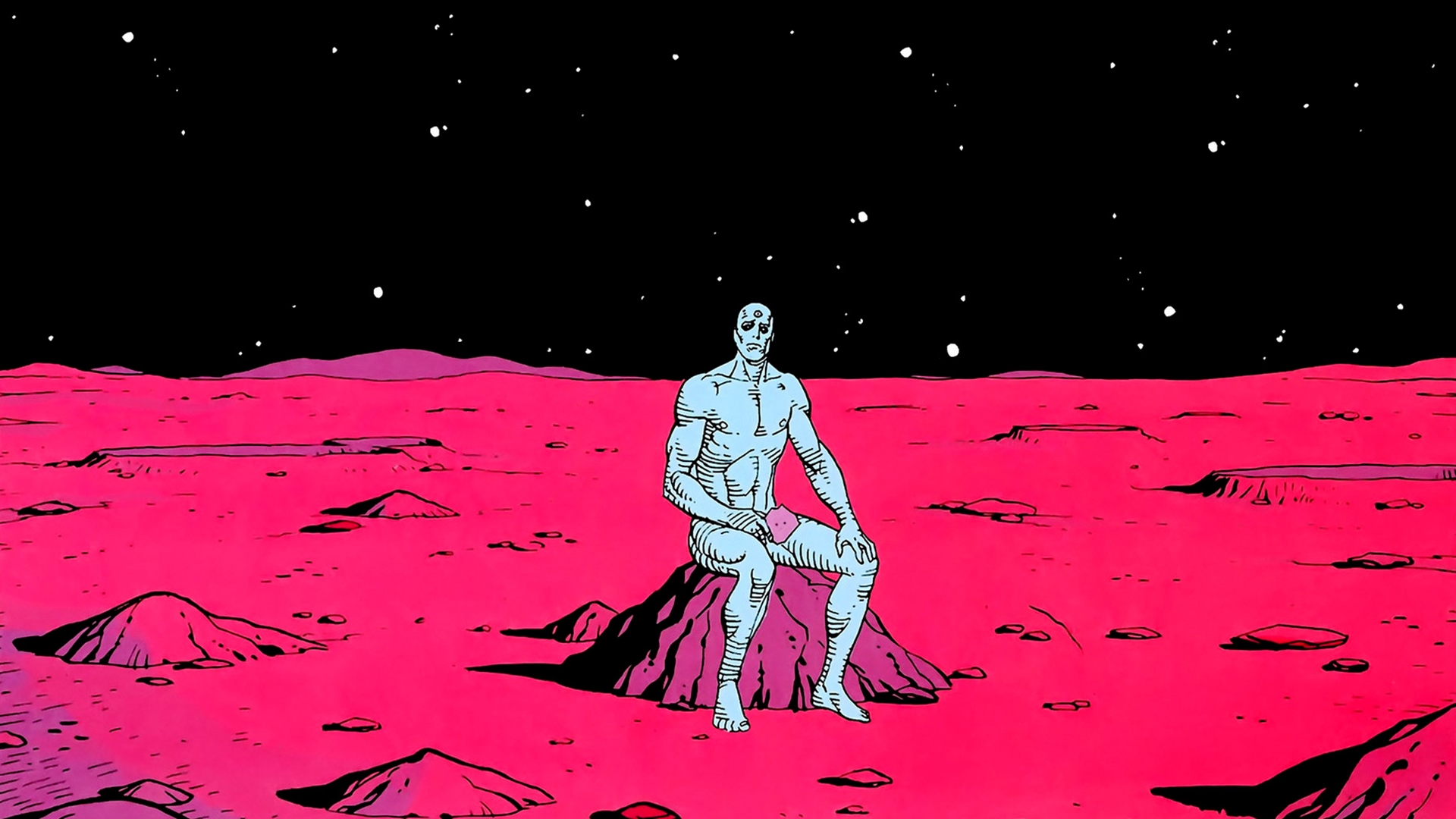 Description: A man standing on a red surface in the middle of the night with a pink sky behind him and stars above.