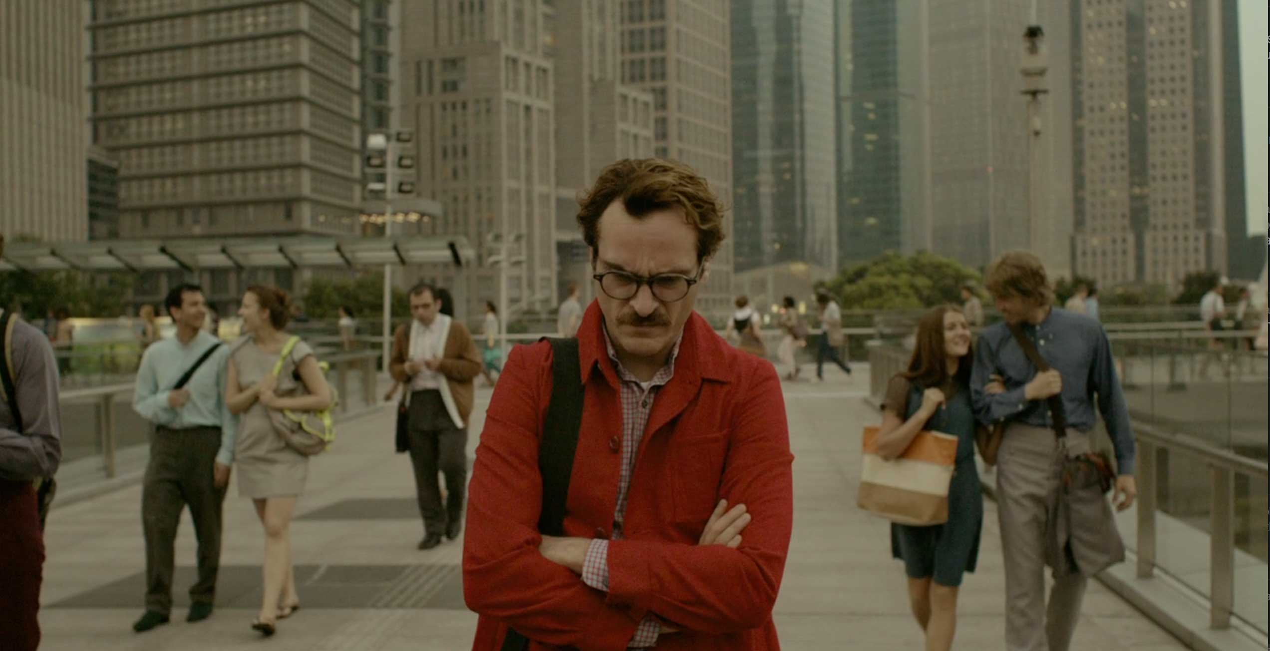 Description: A man in a red jacket is standing on a sidewalk with his arms crossed and people walking around him.