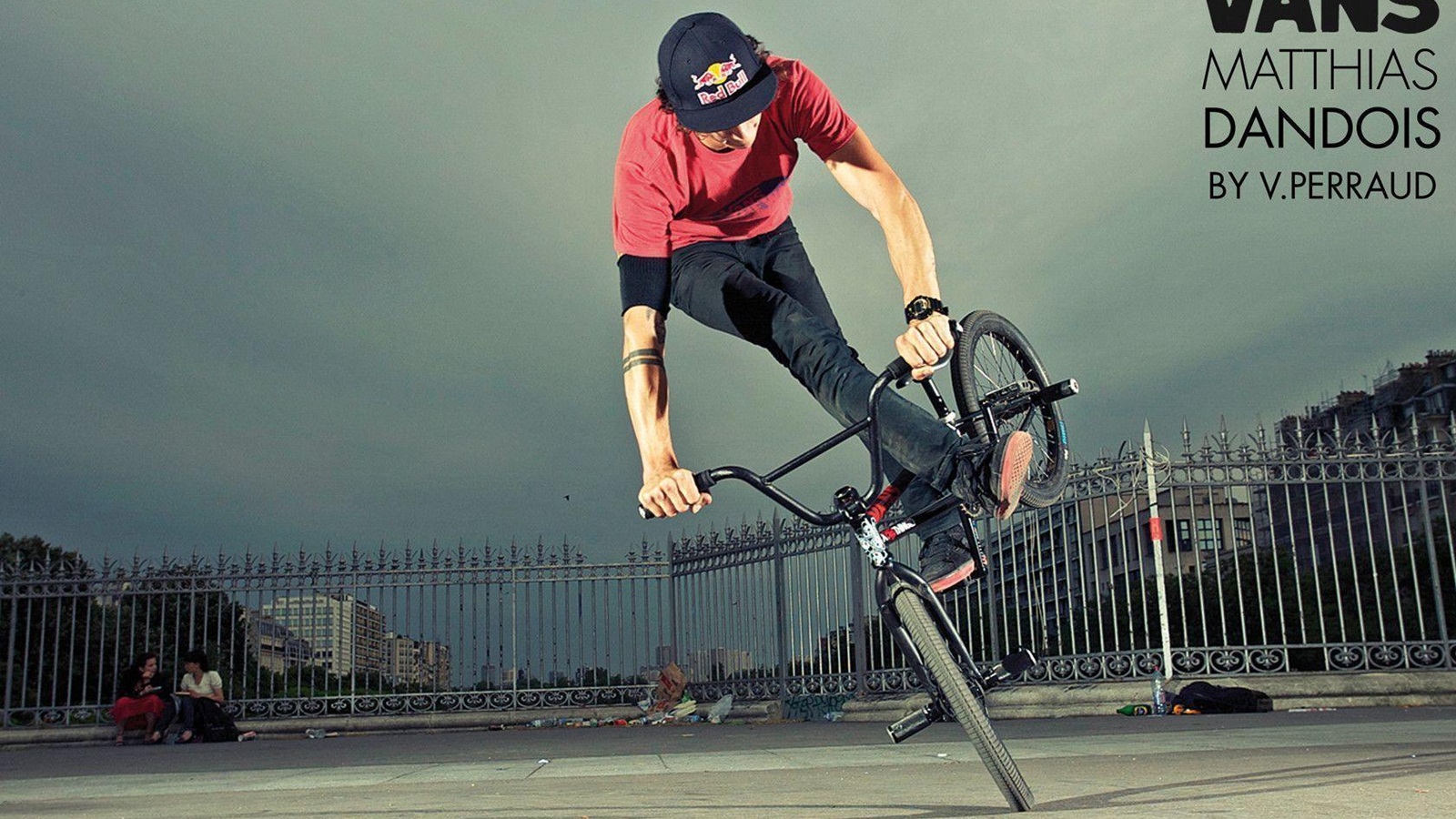 Description: A man riding a bike on top of a cement ground next to a fence and a fenced in area.