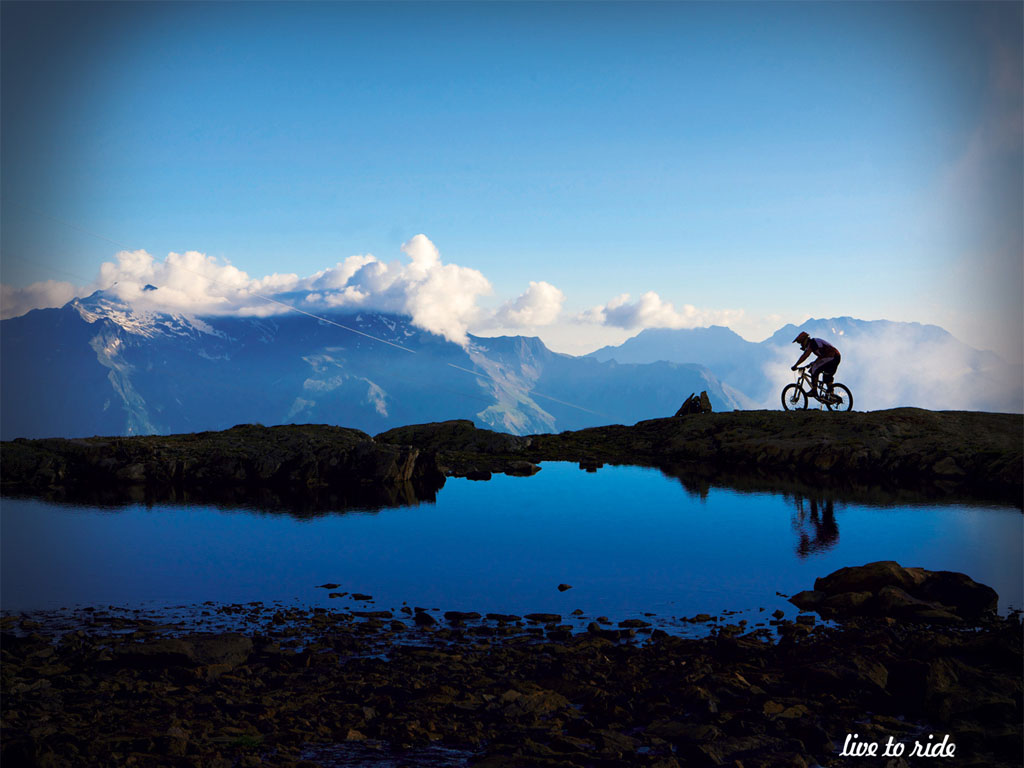 Description: A man riding a bike on top of a mountain next to a lake and mountains in the background with clouds.