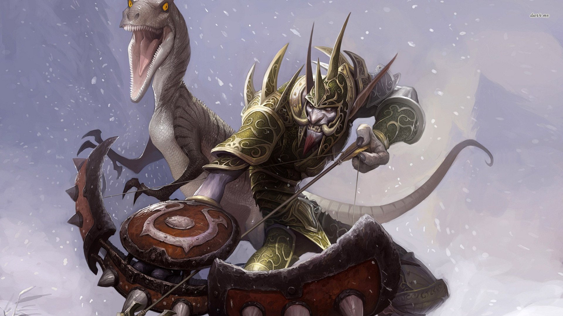 Description: A man riding on the back of a dinosaur next to a giant dinosaur in a snowy forest with a sword.