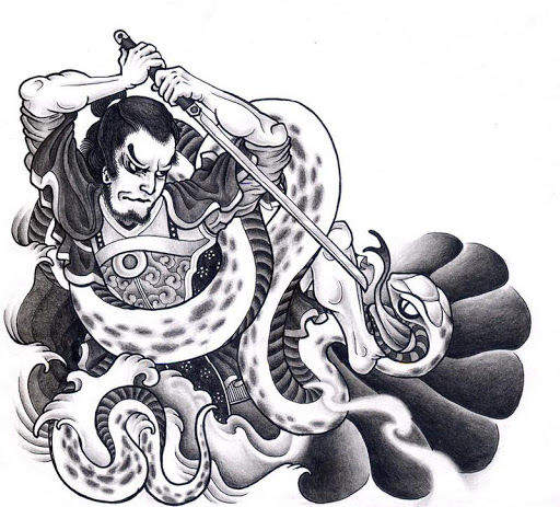 Description: A drawing of a man riding a dragon with a sword in his hand and a snake on his shoulder.