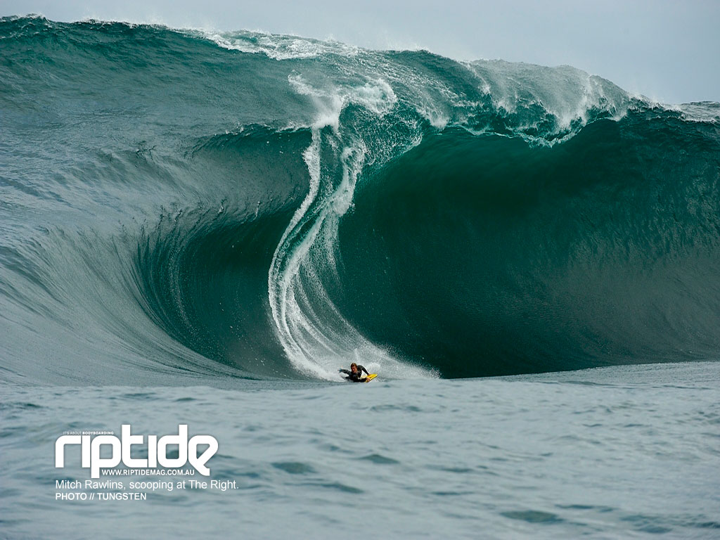 Description: A man riding a wave on top of a surfboard in the ocean with a surfboard in his hand.
