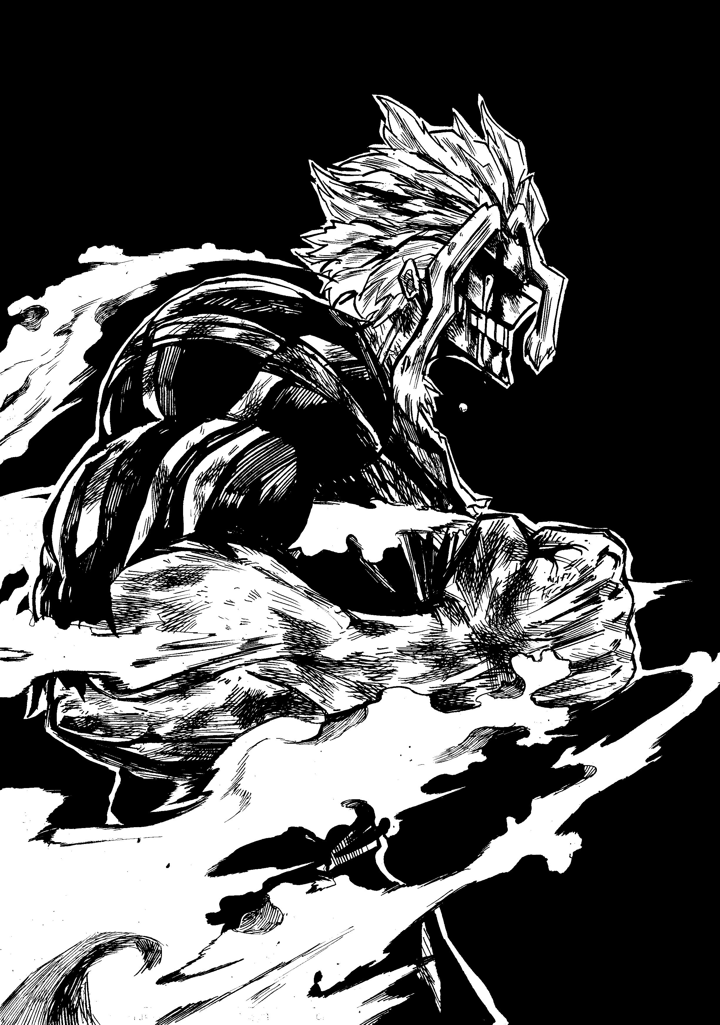 Description: A drawing of a man riding a wave on a surfboard in the ocean with a horse head on his back.
