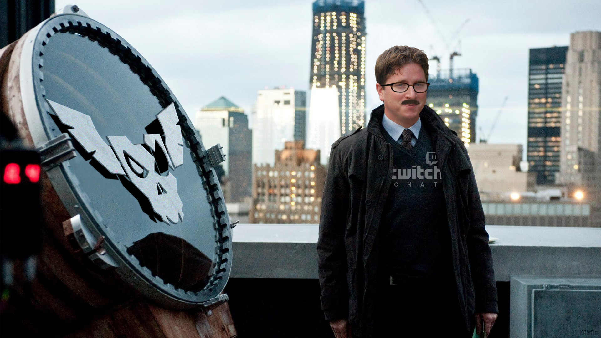 Description: A man standing on a roof with a city in the background with a clock on it's side.